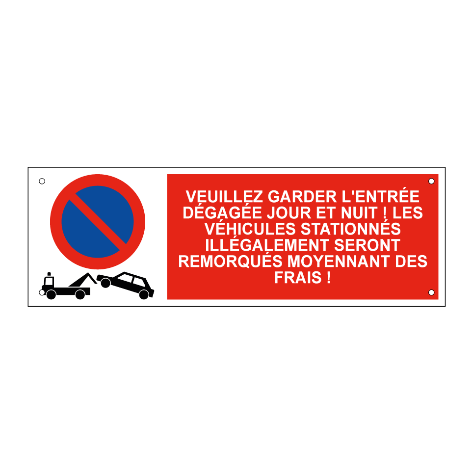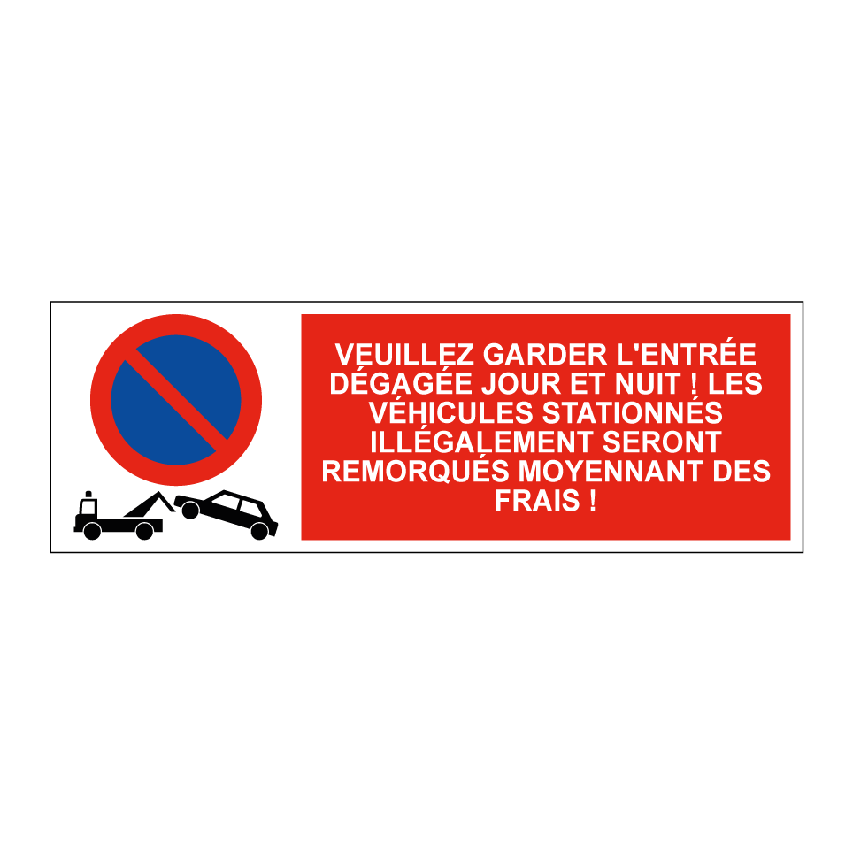Panneau d'interdiction de stationner avec le texte : "Veuillez garder l'entrée dégagée jour et nuit ! Les véhicules stationnés illégalement seront remorqués moyennant des frais !" et une symbolique claire.
