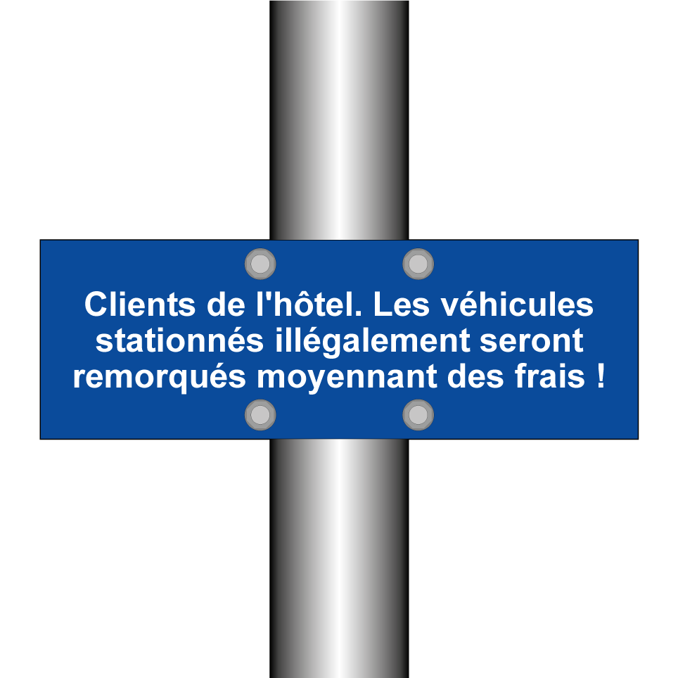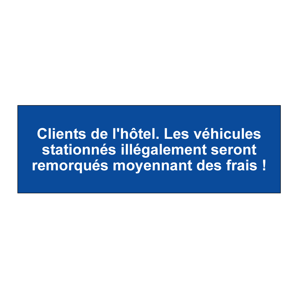 Panneau de stationnement avec le texte : "Clients de l'hôtel. Les véhicules stationnés illégalement seront remorqués moyennant des frais !".