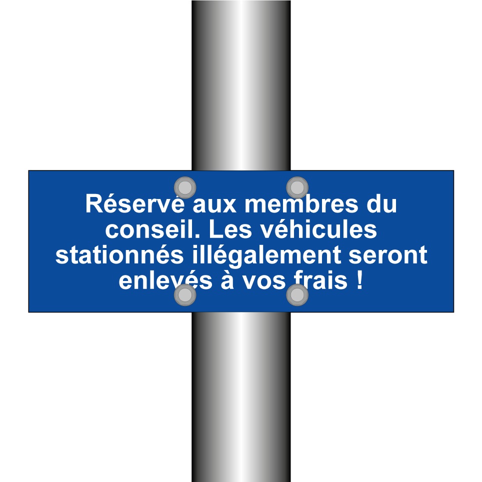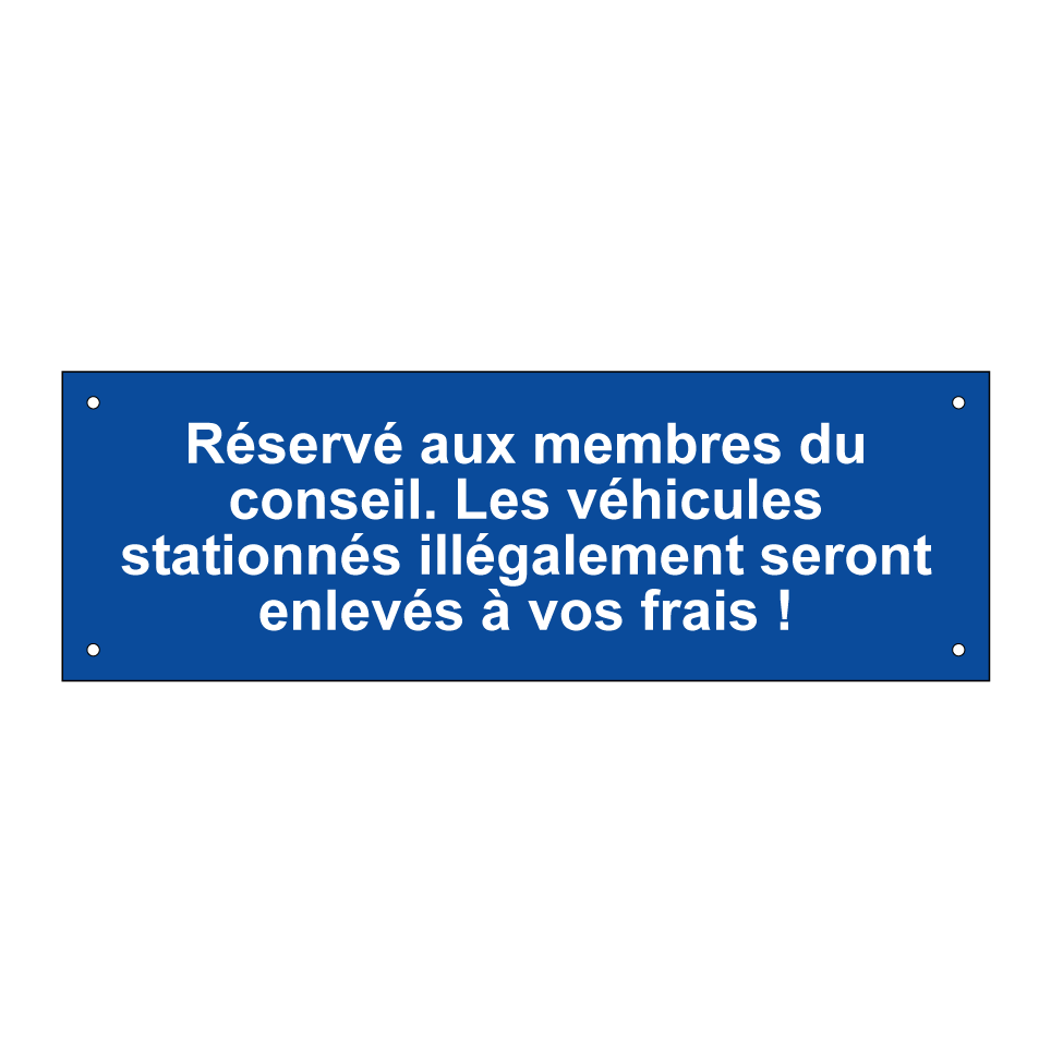 Panneau de stationnement avec le texte : "Réservé aux membres du conseil. Les véhicules stationnés illégalement seront enlevés à vos frais !".