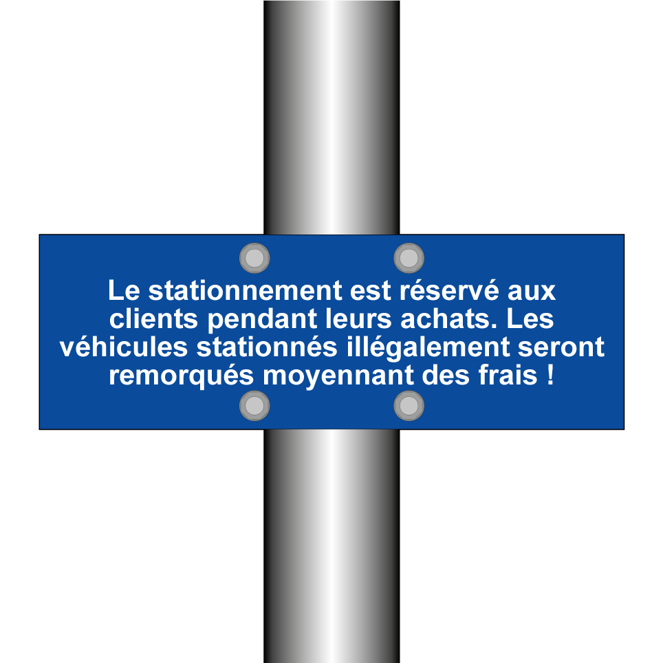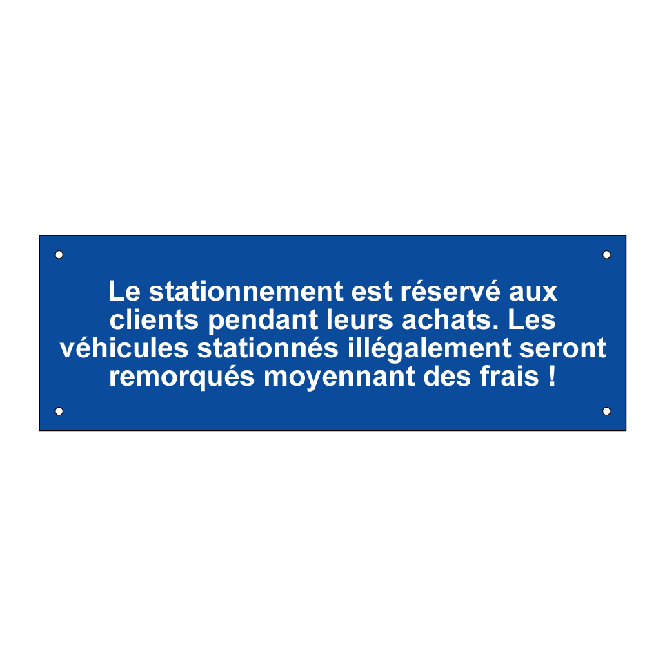 Panneau de stationnement avec le texte : "Le stationnement est réservé aux clients pendant leurs achats. Les véhicules stationnés illégalement seront remorqués moyennant des frais !".