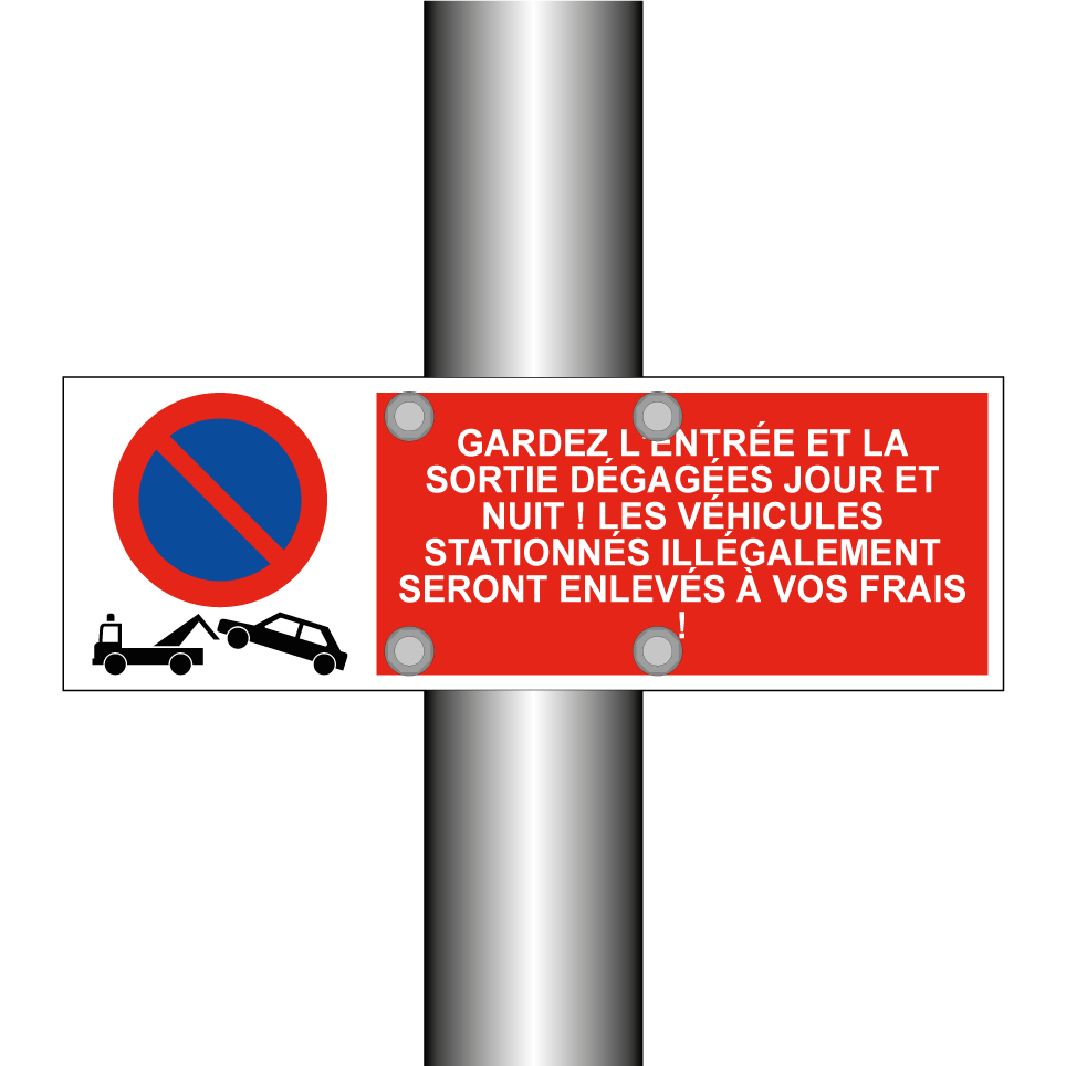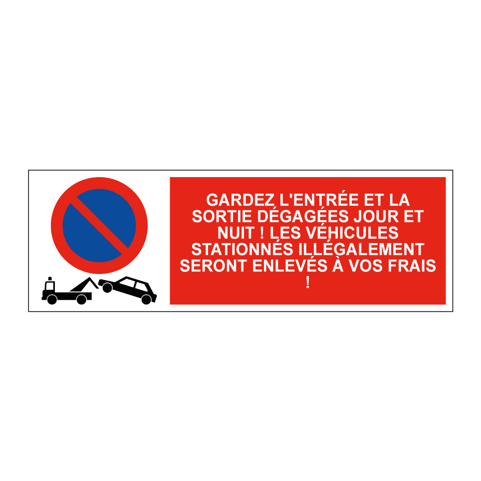 Panneau d'interdiction de stationner avec le texte : "Gardez l'entrée et la sortie dégagées jour et nuit ! Les véhicules stationnés illégalement seront enlevés à vos frais !" et une symbolique claire.