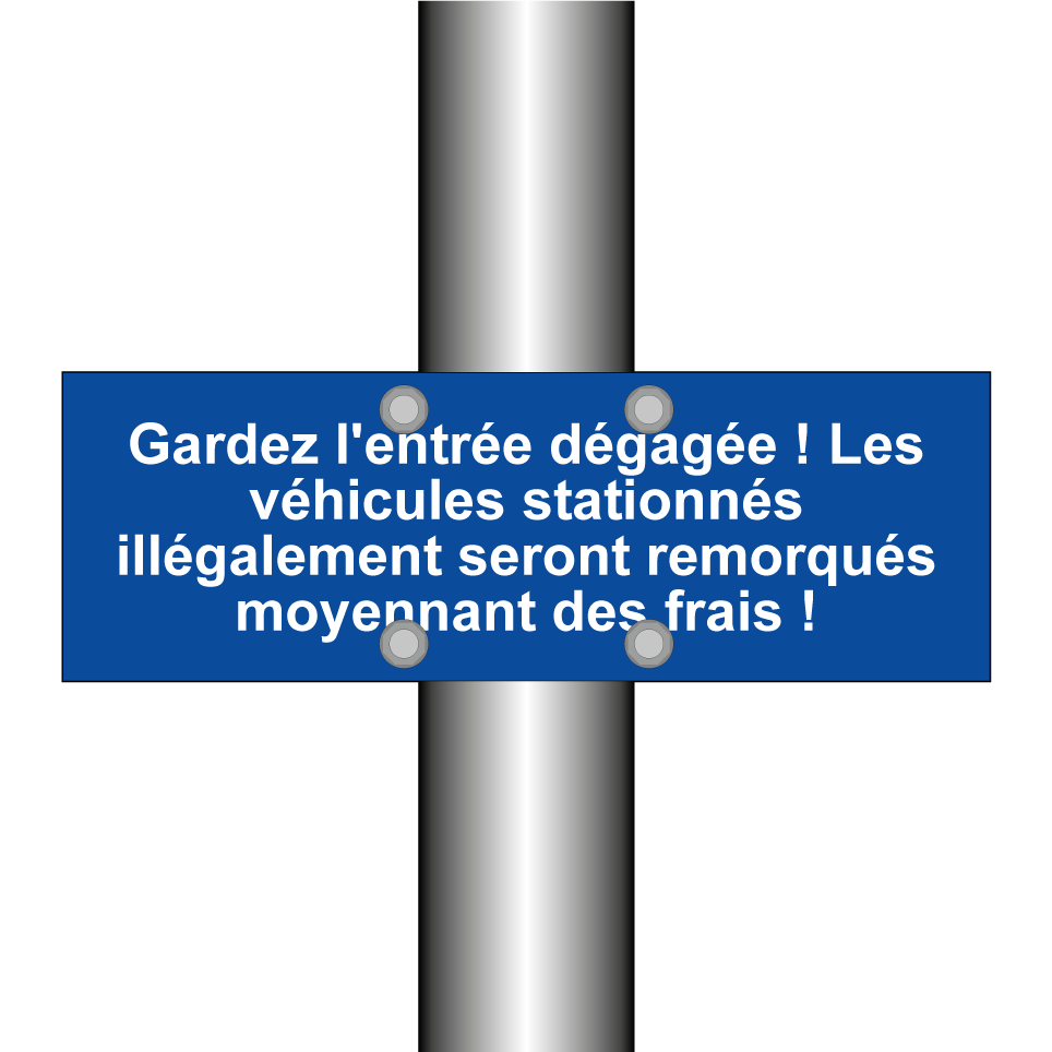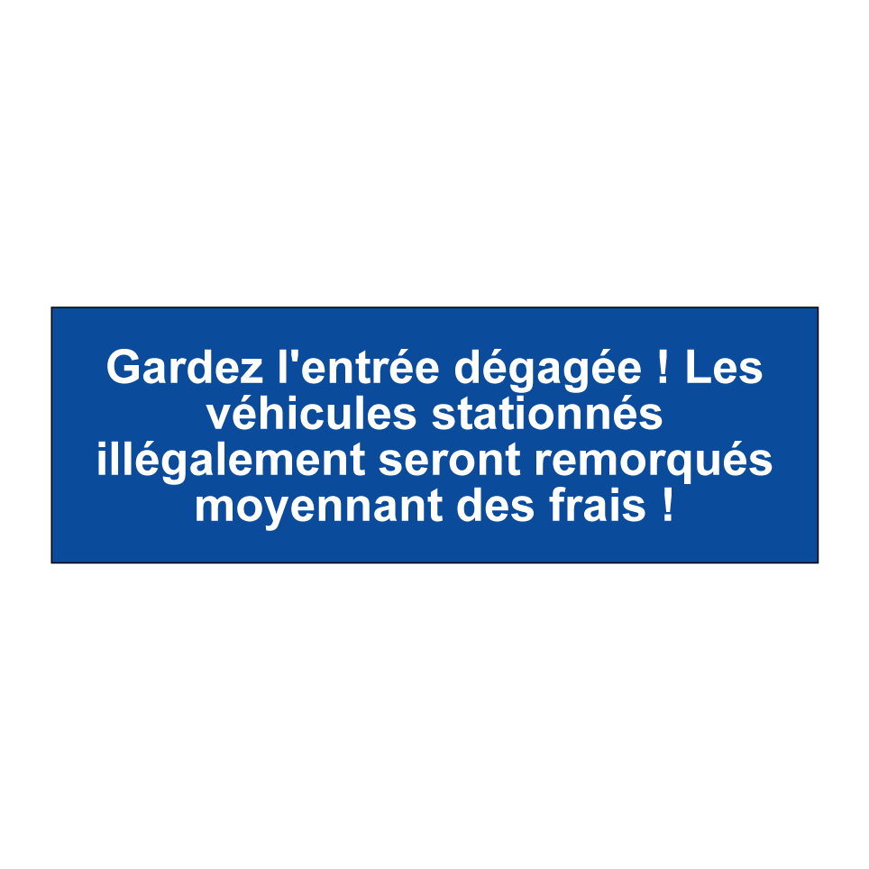 Panneau de stationnement avec le texte : "Gardez l'entrée dégagée ! Les véhicules stationnés illégalement seront remorqués moyennant des frais !".
