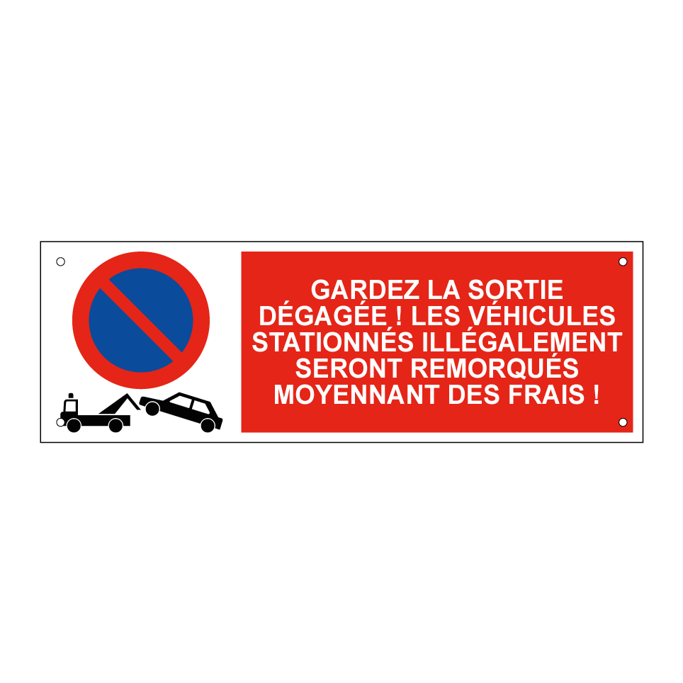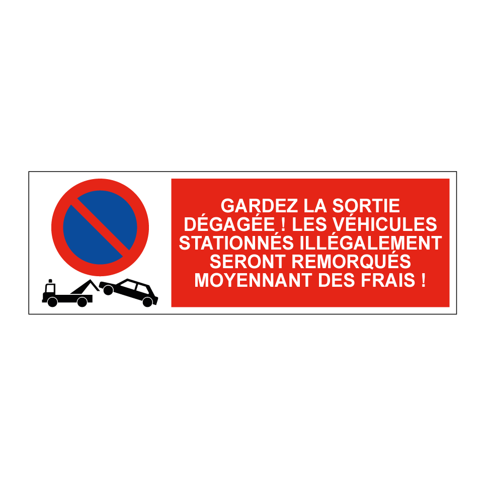 Panneau d'interdiction de stationner avec le texte : "Gardez la sortie dégagée ! Les véhicules stationnés illégalement seront remorqués moyennant des frais !" et une symbolique claire.