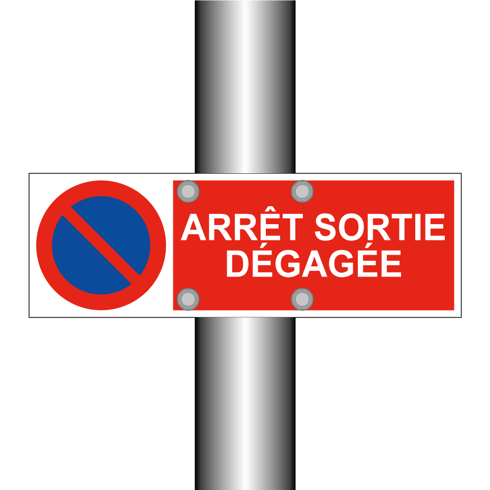 Panneau d'interdiction de stationner avec le texte : "Arrêt Sortie dégagée" et une symbolique claire.