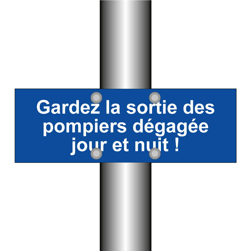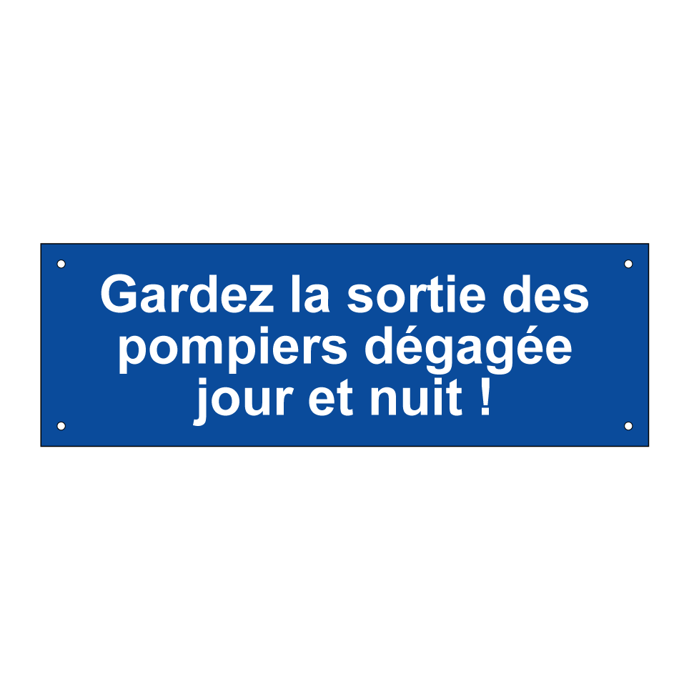 Panneau d'interdiction de stationner avec le texte : "Gardez la sortie des pompiers dégagée jour et nuit !".