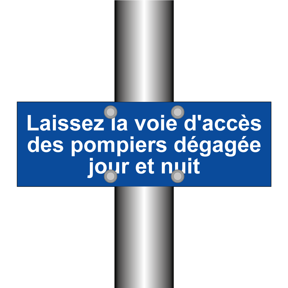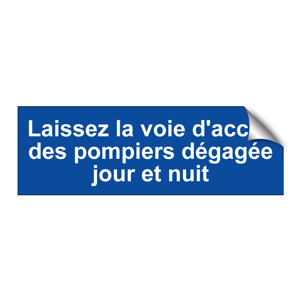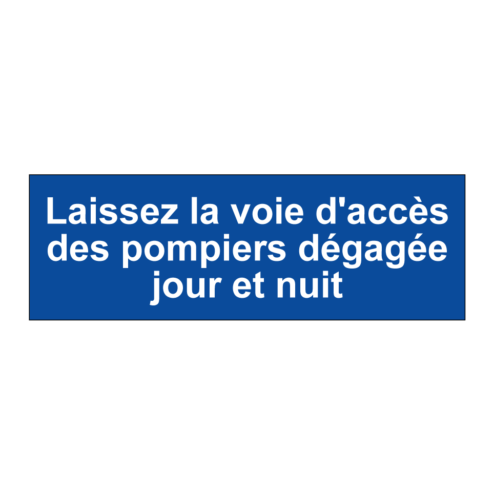 Panneau d'interdiction de stationner avec le texte : "Laissez la voie d'accès des pompiers dégagée jour et nuit".