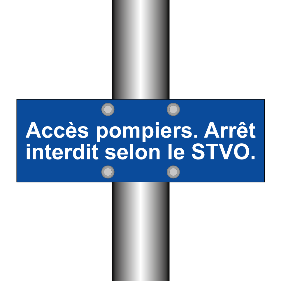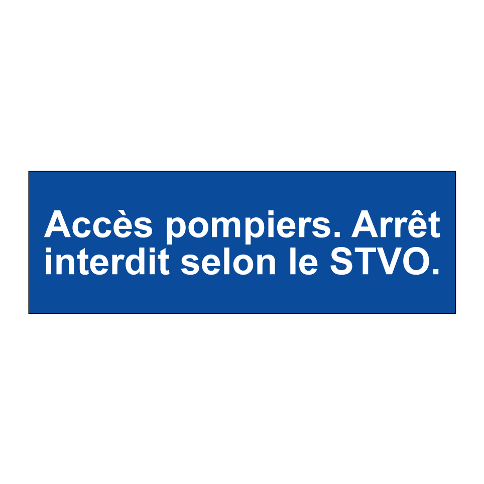 Panneau d'interdiction de stationner avec le texte : "Accès pompiers. Arrêt interdit selon le STVO.".