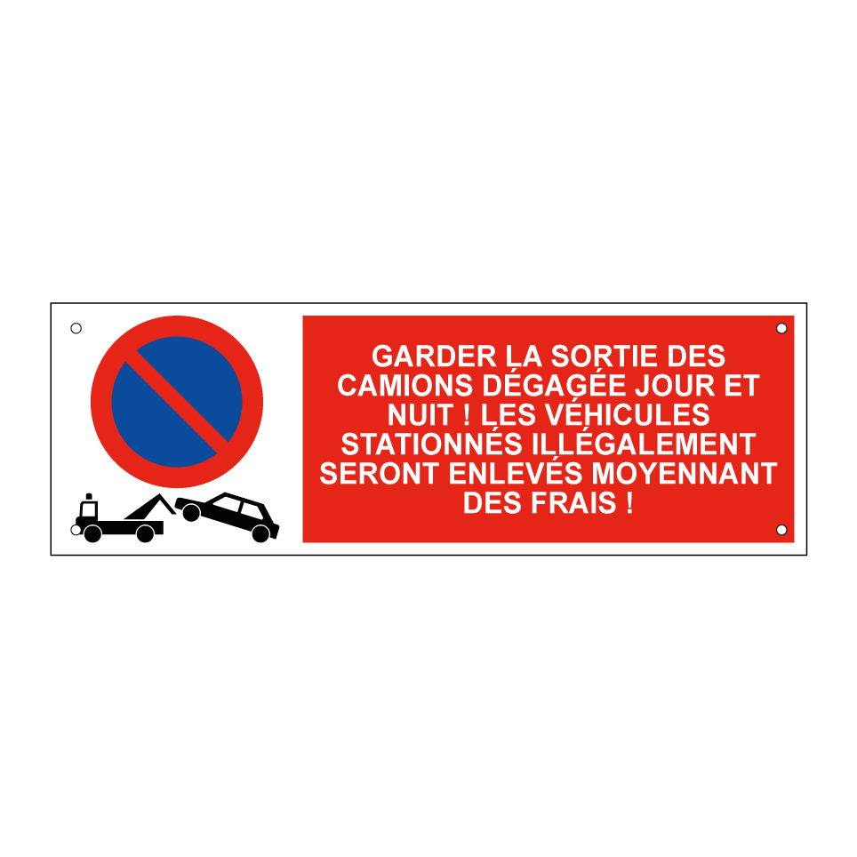 Ce panneau de stationnement interdit est idéal pour les zones industrielles, les entrepôts et les sorties de camions. Il assure que les voies d'accès restent dégagées en tout temps, évitant ainsi les interruptions d'activité. Placez-le à l'entrée ou à la sortie des zones de chargement pour avertir les conducteurs des conséquences du stationnement illégal. Sa couleur rouge et son texte clair garantissent une visibilité optimale, même de loin, renforçant ainsi la sécurité et la fluidité du trafic.