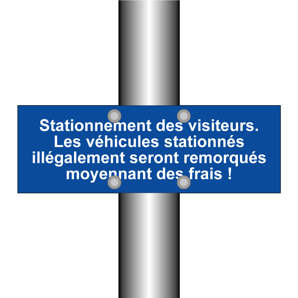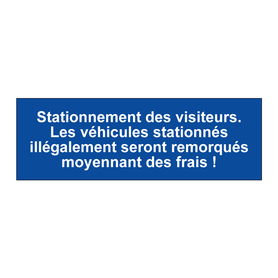 Panneau de stationnement avec le texte : "Stationnement des visiteurs. Les véhicules stationnés illégalement seront remorqués moyennant des frais !".