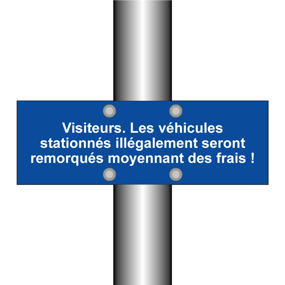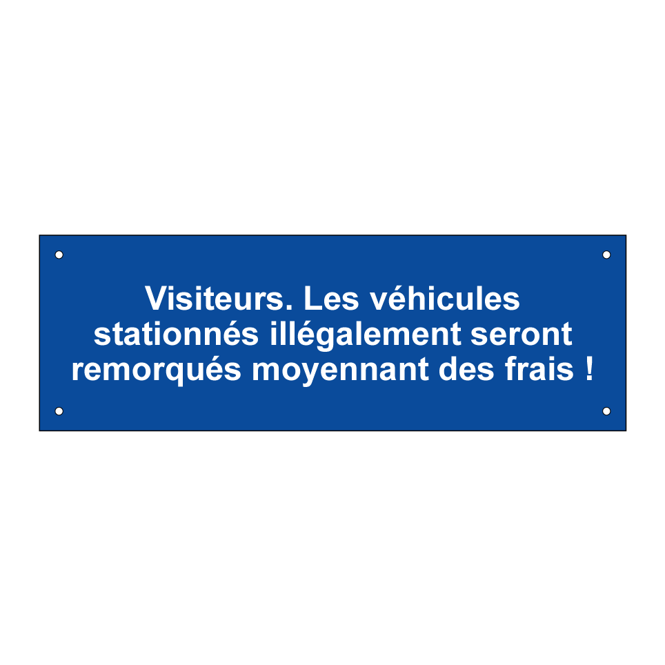 Panneau de stationnement avec le texte : "Visiteurs. Les véhicules stationnés illégalement seront remorqués moyennant des frais !".