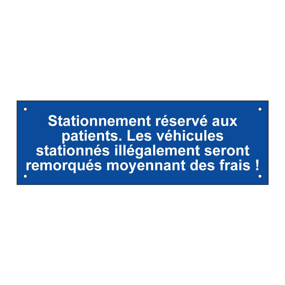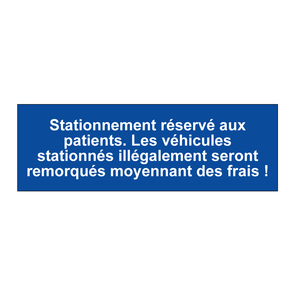 Panneau de stationnement avec le texte : "Stationnement réservé aux patients. Les véhicules stationnés illégalement seront remorqués moyennant des frais !".