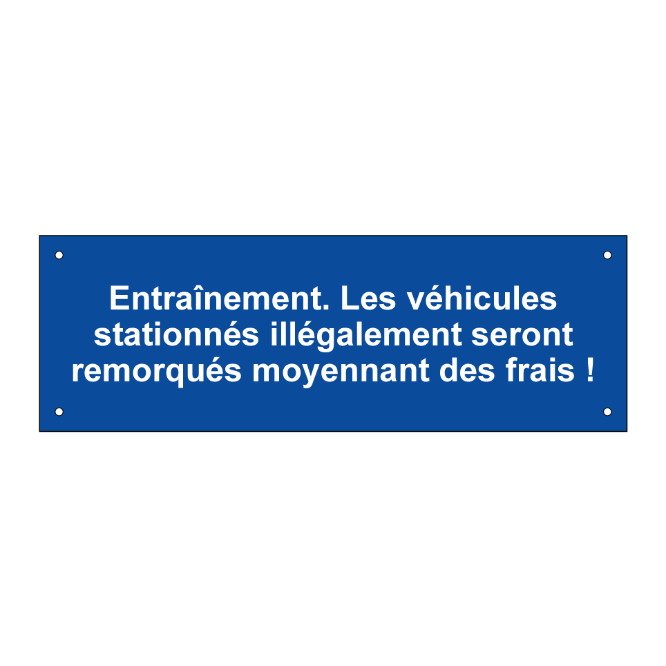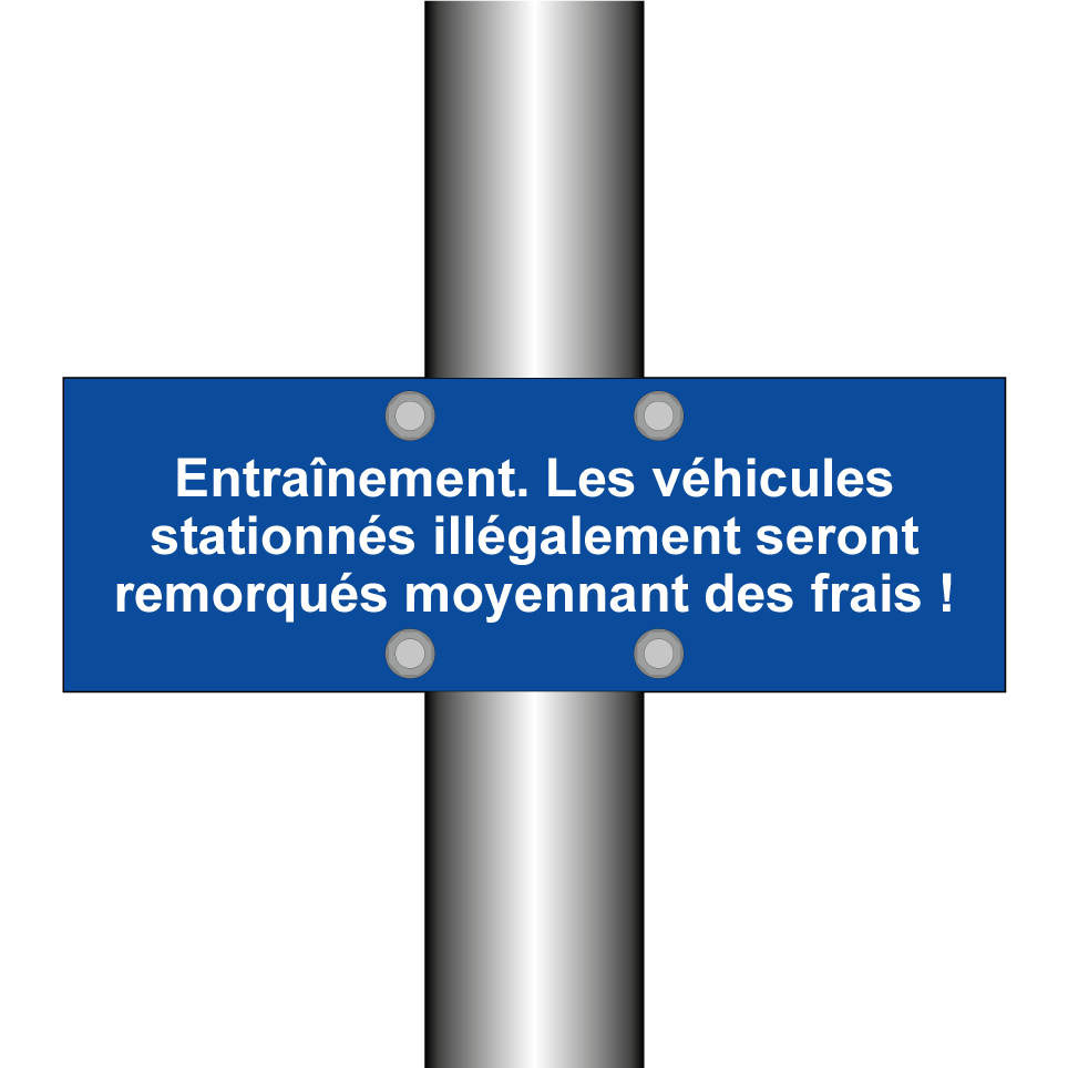 Panneau de stationnement avec le texte : "Entraînement. Les véhicules stationnés illégalement seront remorqués moyennant des frais !".