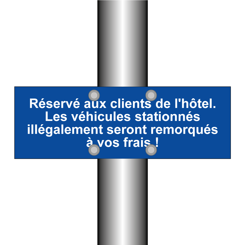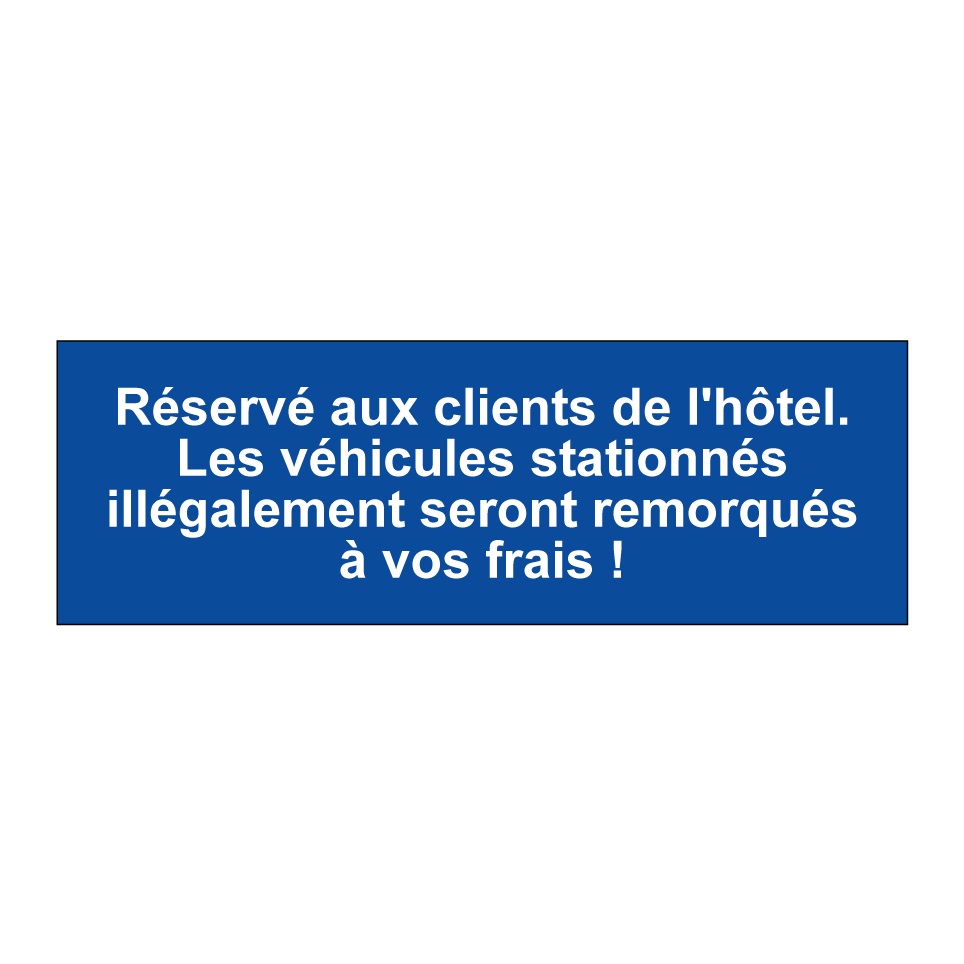 Panneau de stationnement avec le texte : "Réservé aux clients de l'hôtel. Les véhicules stationnés illégalement seront remorqués à vos frais !".