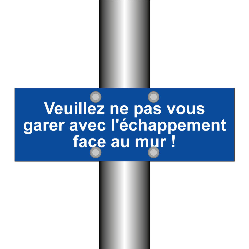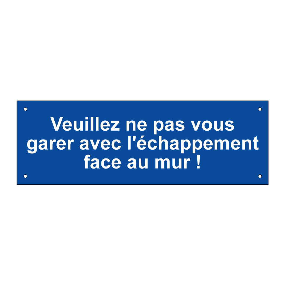 Panneau d'interdiction de stationner avec le texte : "Veuillez ne pas vous garer avec l'échappement face au mur !".
