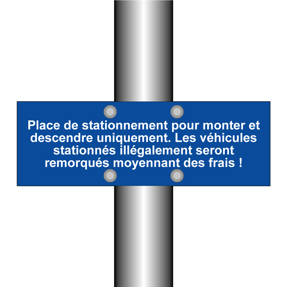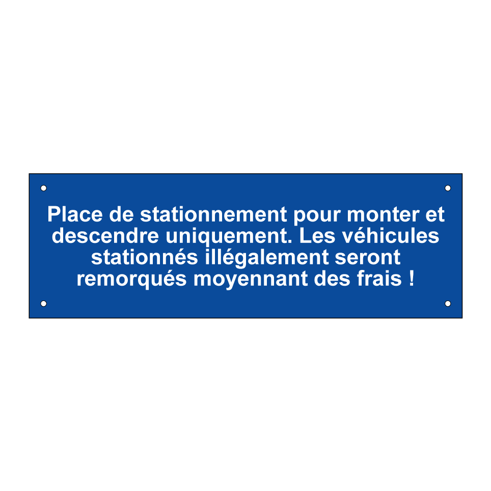 Panneau de stationnement avec le texte : "Place de stationnement pour monter et descendre uniquement. Les véhicules stationnés illégalement seront remorqués moyennant des frais !".
