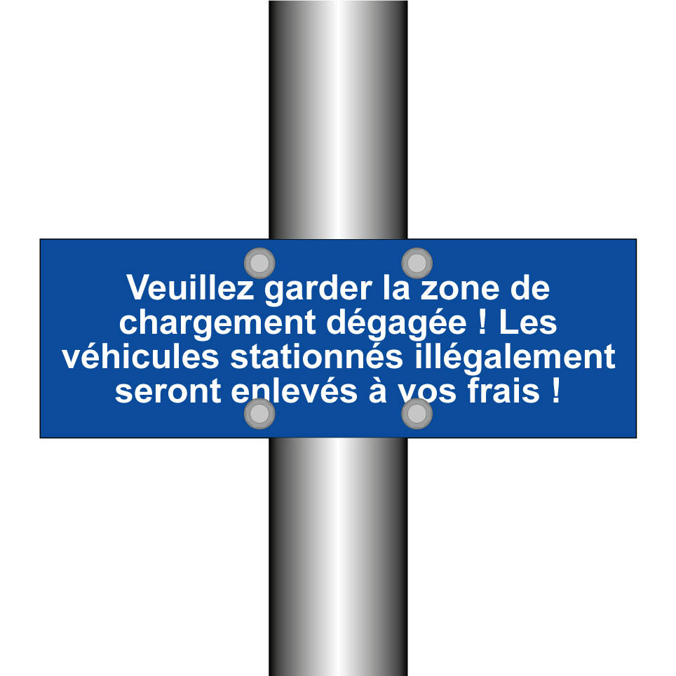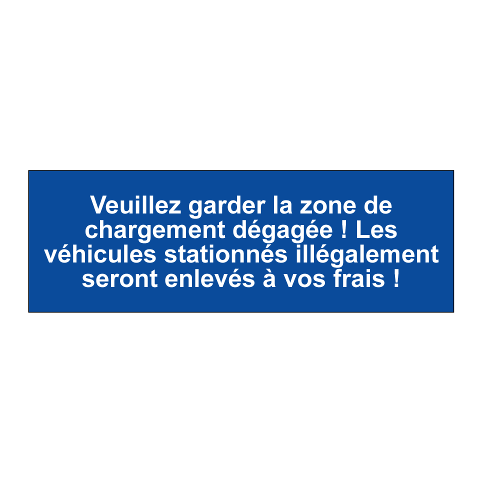 Panneau de stationnement avec le texte : "Veuillez garder la zone de chargement dégagée ! Les véhicules stationnés illégalement seront enlevés à vos frais !".