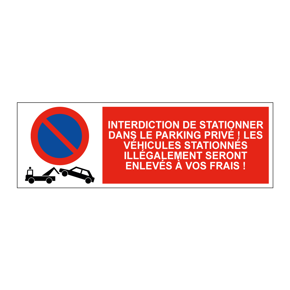 Panneau d'interdiction de stationner avec le texte : "Interdiction de stationner dans le parking privé ! Les véhicules stationnés illégalement seront enlevés à vos frais !" et une symbolique claire.