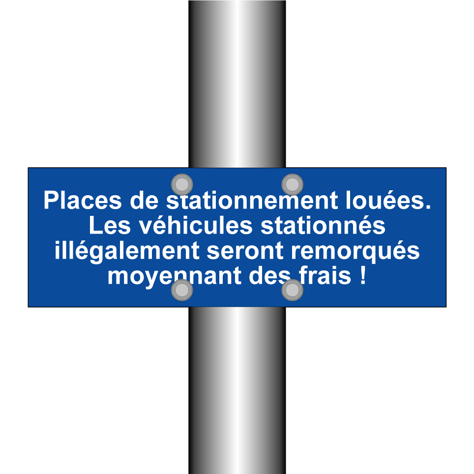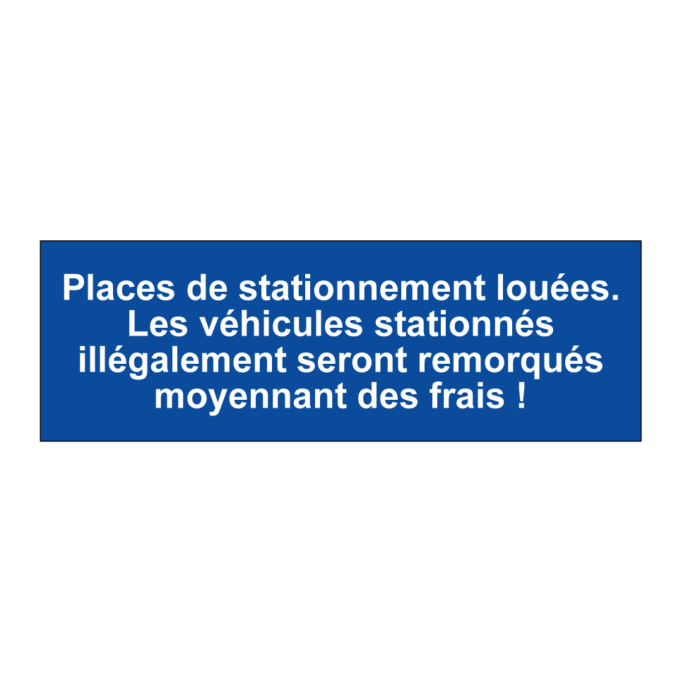 Panneau de stationnement avec le texte : "Places de stationnement louées. Les véhicules stationnés illégalement seront remorqués moyennant des frais !".