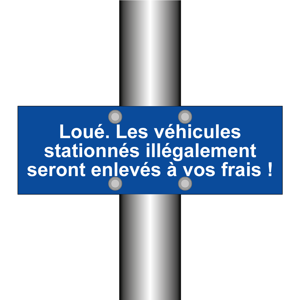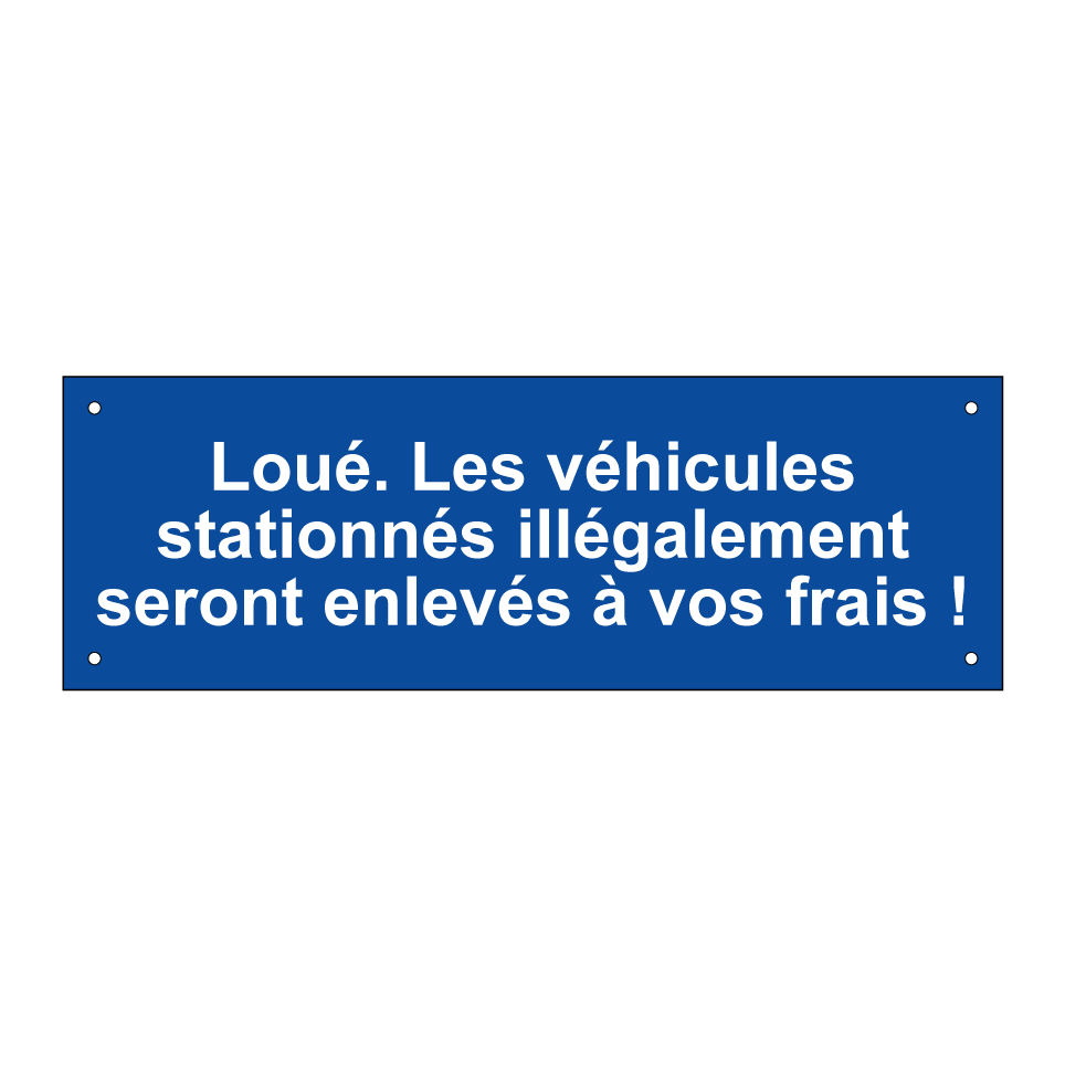 Panneau de stationnement avec le texte : "Loué. Les véhicules stationnés illégalement seront enlevés à vos frais !".
