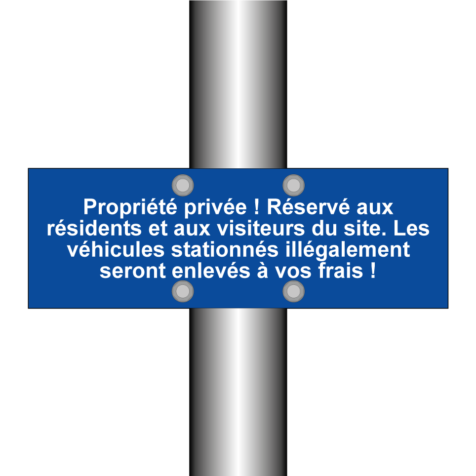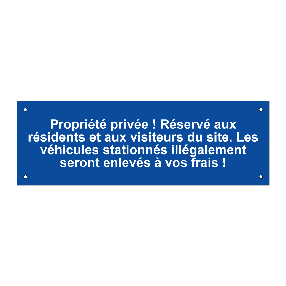 Panneau de stationnement avec le texte : "Propriété privée ! Réservé aux résidents et aux visiteurs du site. Les véhicules stationnés illégalement seront enlevés à vos frais !".