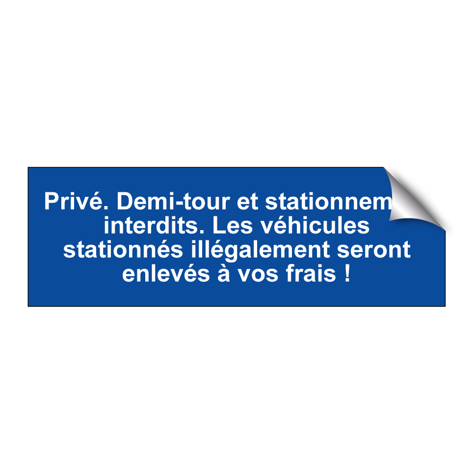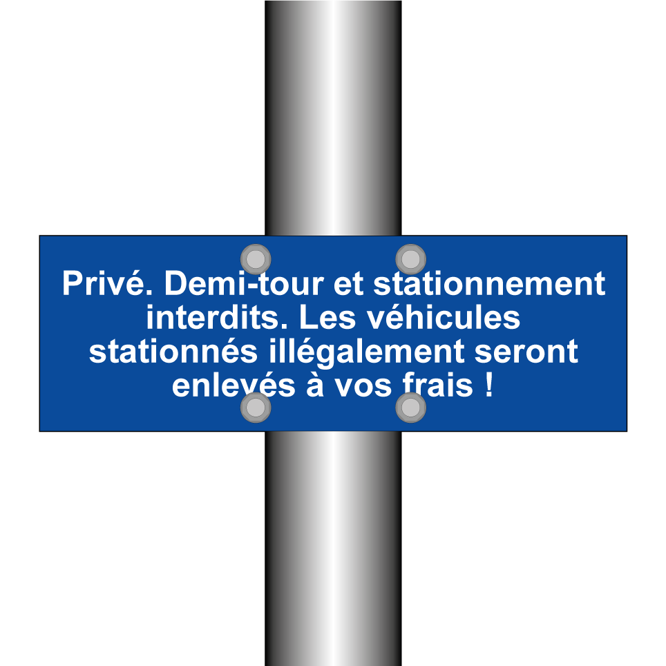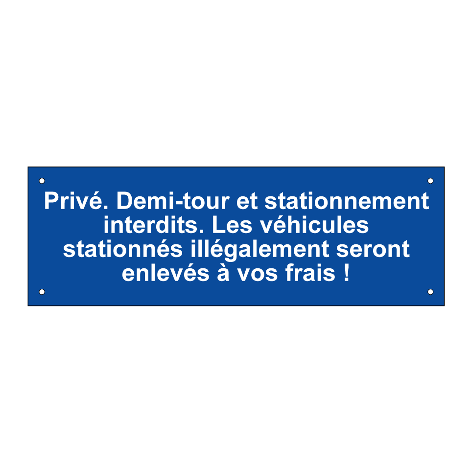 Panneau de stationnement avec le texte : "Privé. Demi-tour et stationnement interdits. Les véhicules stationnés illégalement seront enlevés à vos frais !".