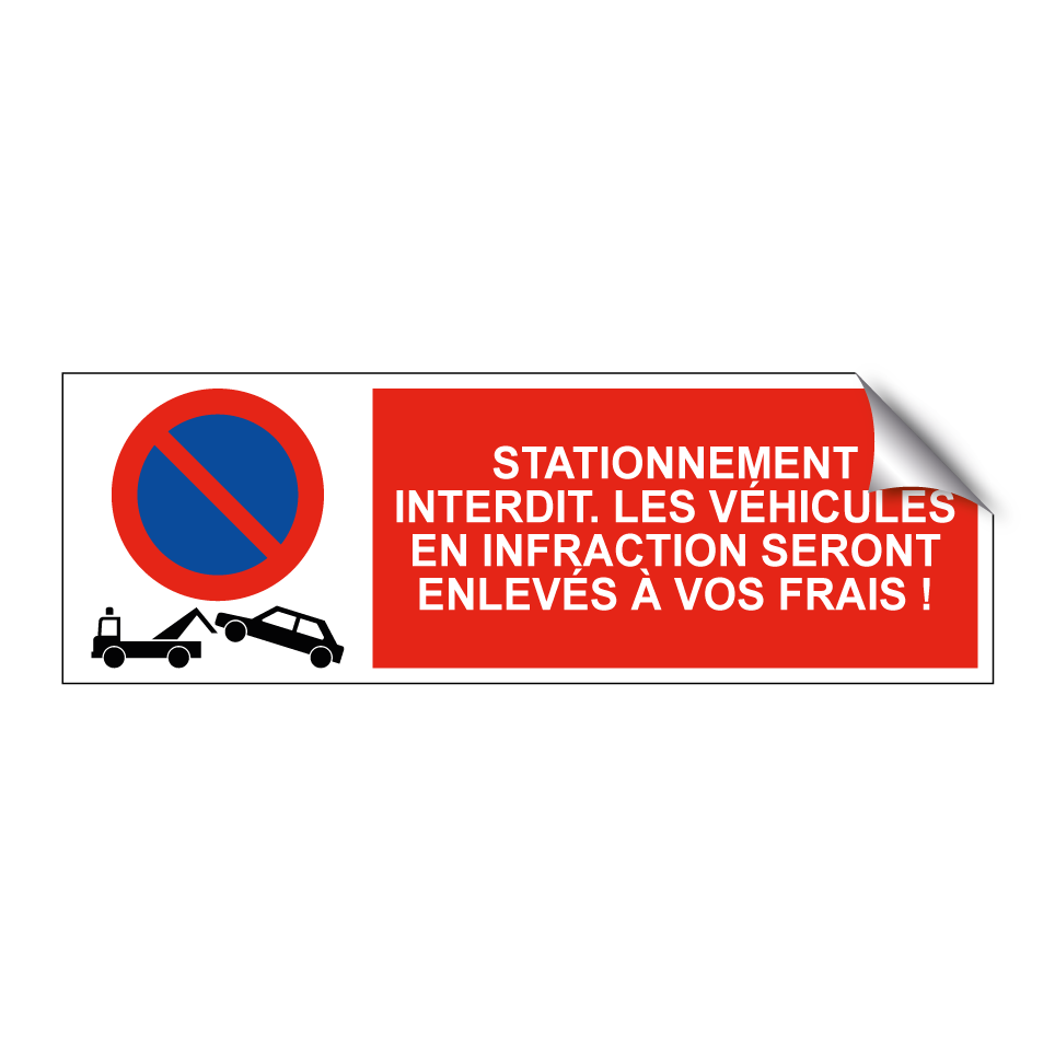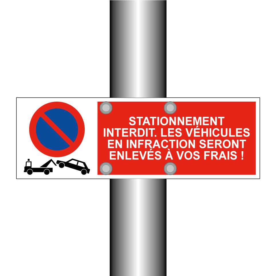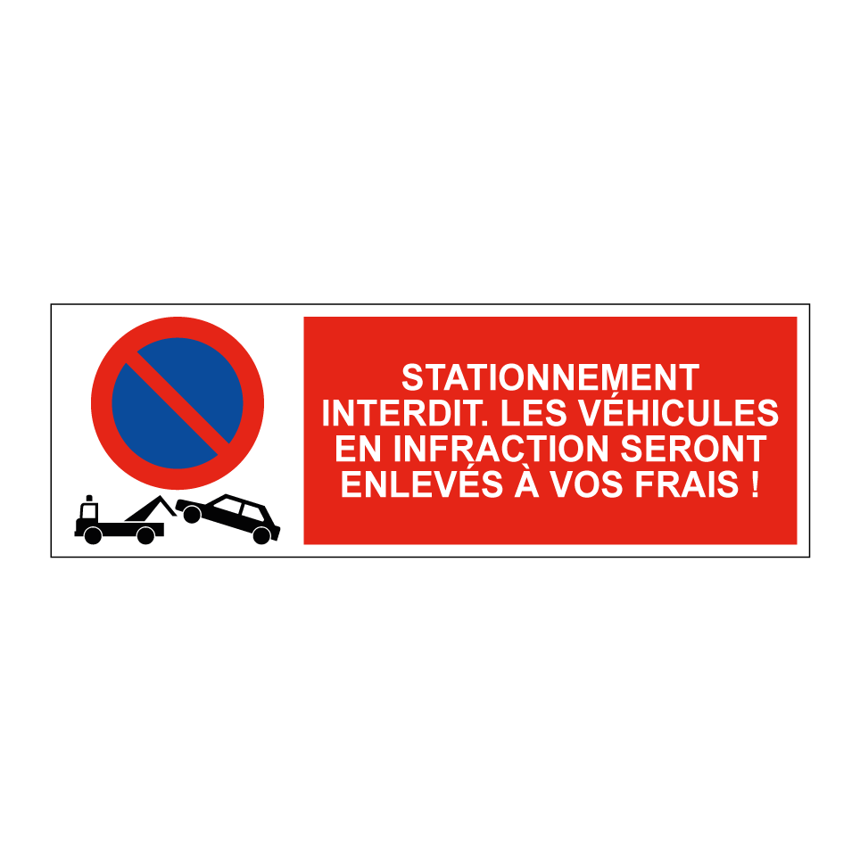 Panneau d'interdiction de stationner avec le texte : "Stationnement interdit. Les véhicules en infraction seront enlevés à vos frais !" et une symbolique claire.