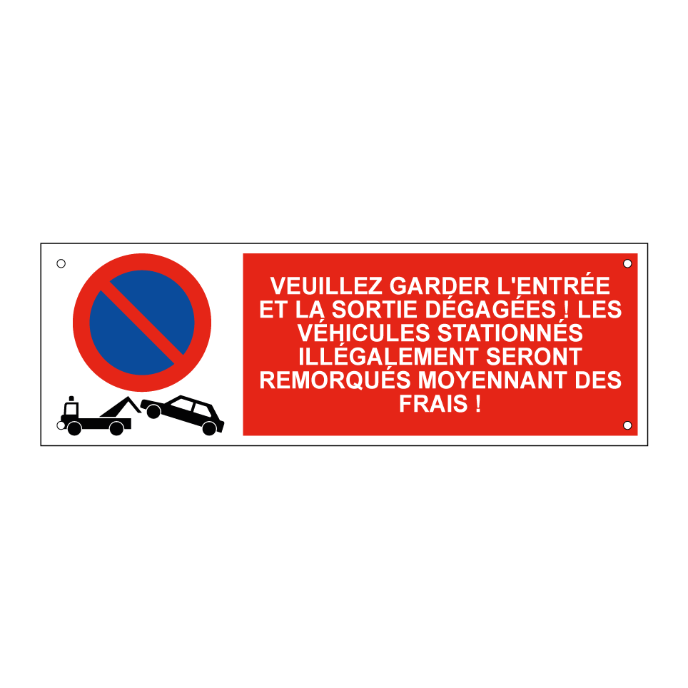 Panneau d'interdiction de stationner avec le texte : "Veuillez garder l'entrée et la sortie dégagées ! Les véhicules stationnés illégalement seront remorqués moyennant des frais !" et une symbolique claire.
