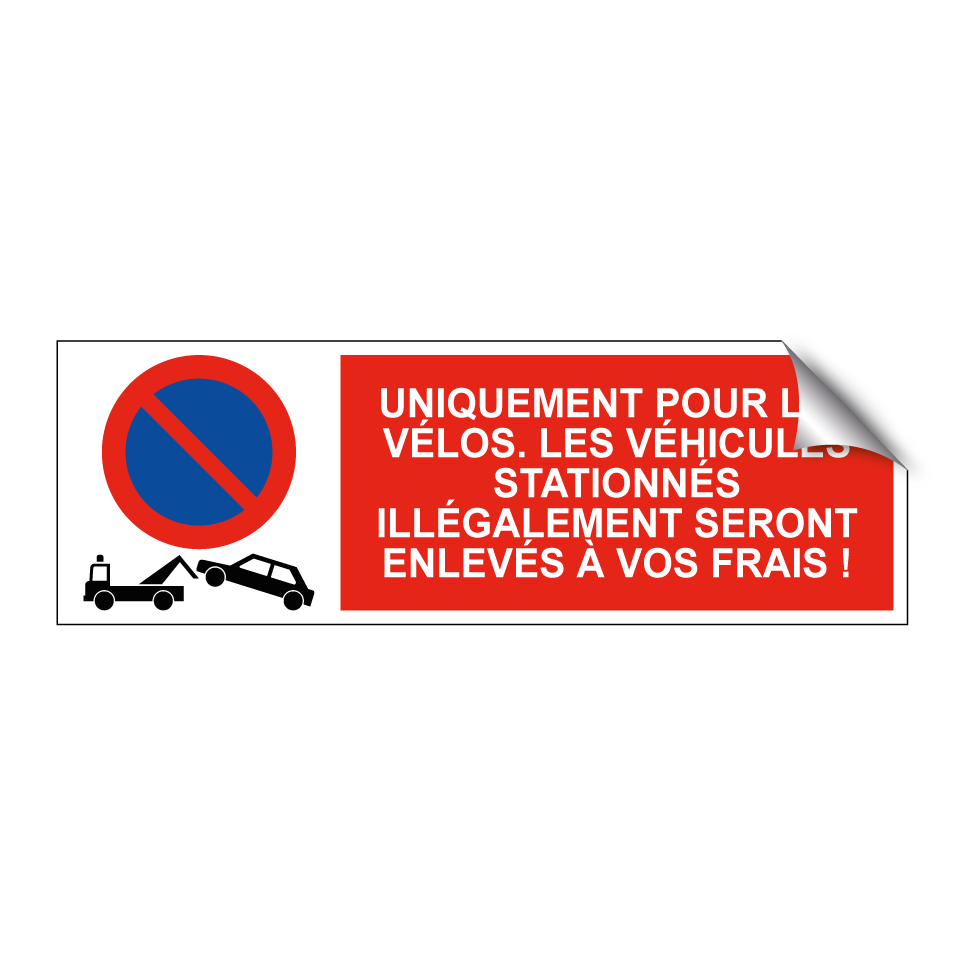 Panneau d'interdiction de stationner avec le texte : "Uniquement pour les vélos. Les véhicules stationnés illégalement seront enlevés à vos frais !" et une symbolique claire.