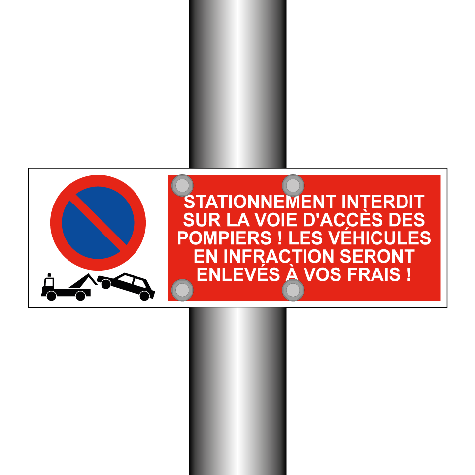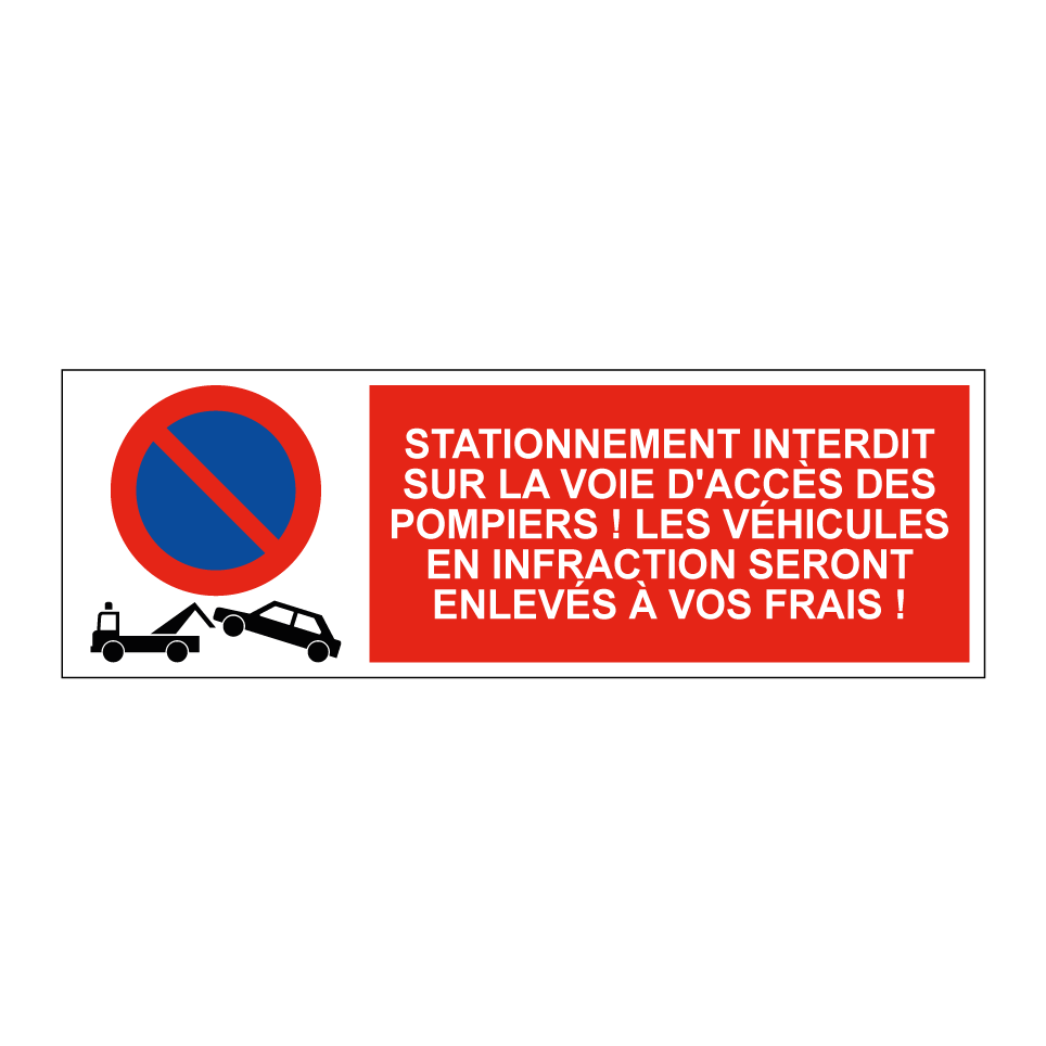 Panneau d'interdiction de stationner avec le texte : "Stationnement interdit sur la voie d'accès des pompiers ! Les véhicules en infraction seront enlevés à vos frais !" et une symbolique claire.