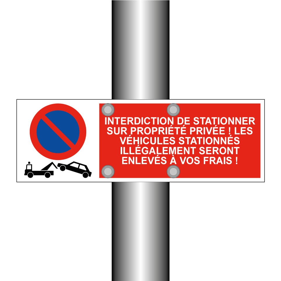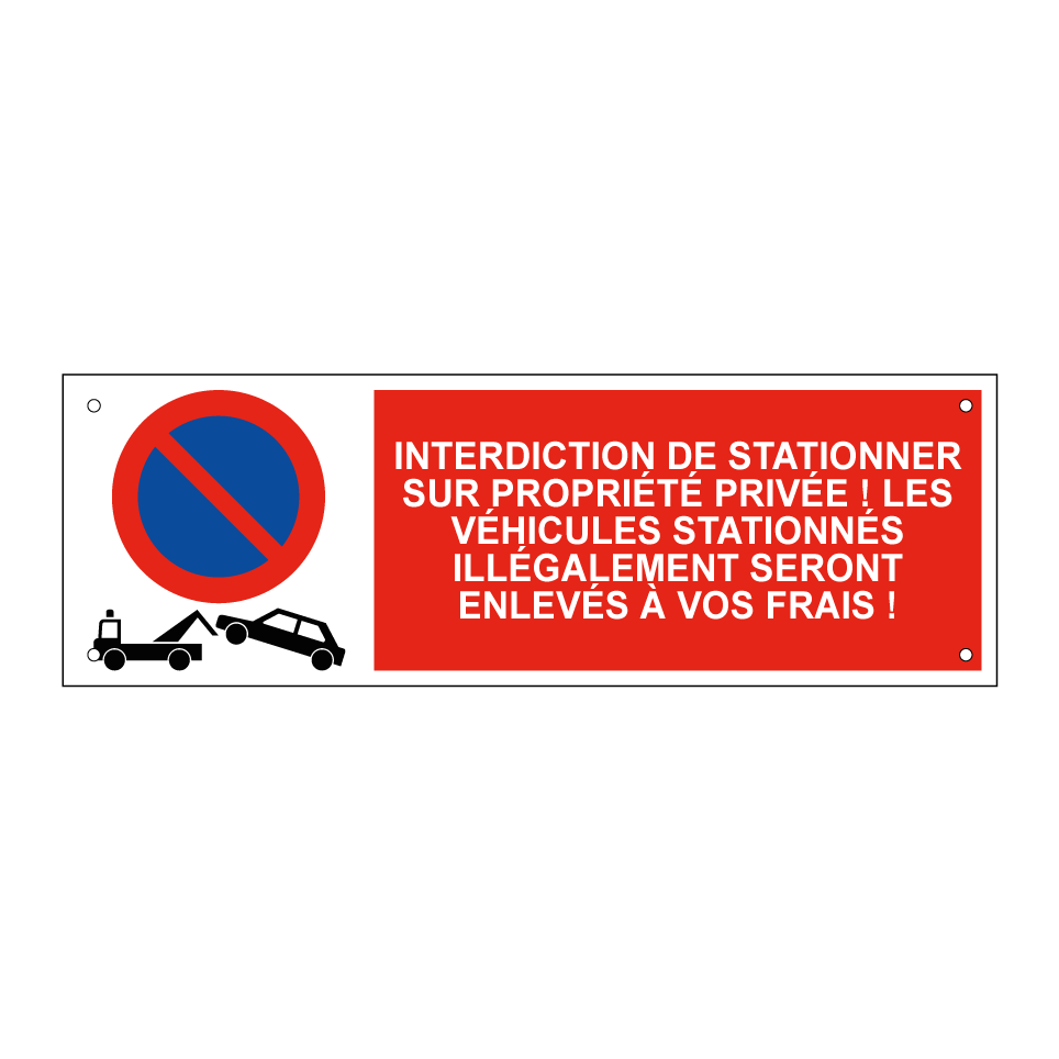 Panneau d'interdiction de stationner avec le texte : "Interdiction de stationner sur propriété privée ! Les véhicules stationnés illégalement seront enlevés à vos frais !" et une symbolique claire.