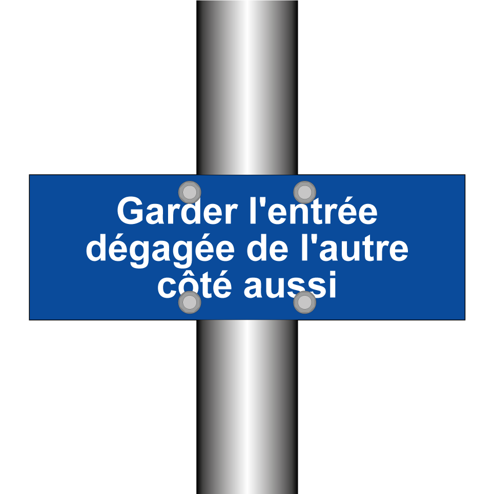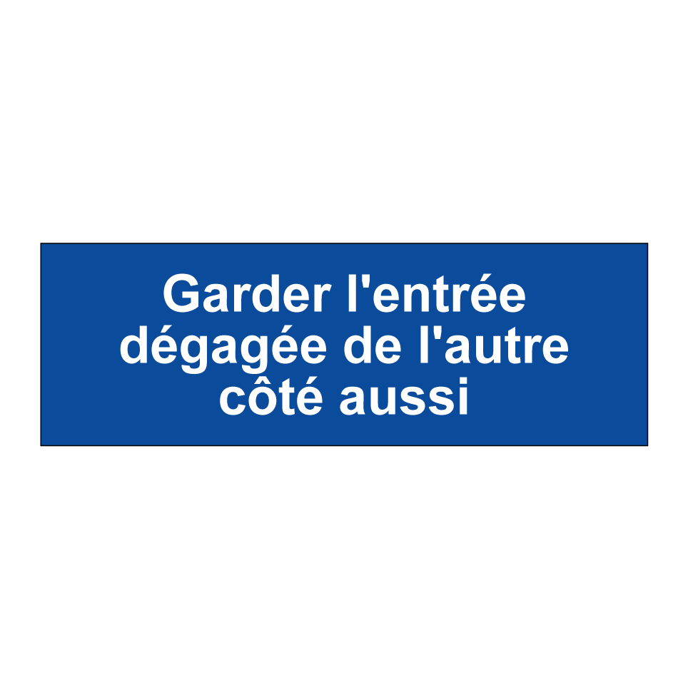 Panneau d'interdiction de stationner avec le texte : "Garder l'entrée dégagée de l'autre côté aussi".