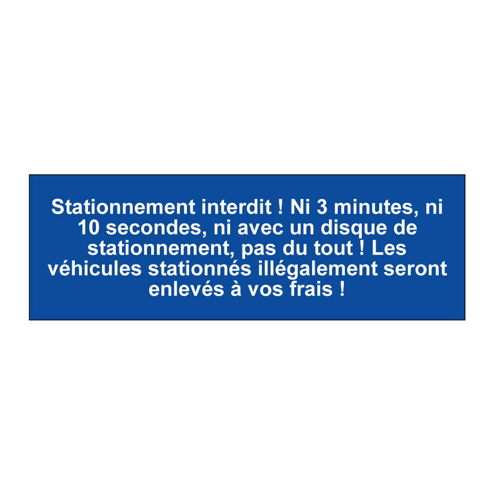 Panneau d'interdiction de stationner avec le texte : "Stationnement interdit ! Ni 3 minutes, ni 10 secondes, ni avec un disque de stationnement, pas du tout ! Les véhicules stationnés illégalement seront enlevés à vos frais !".