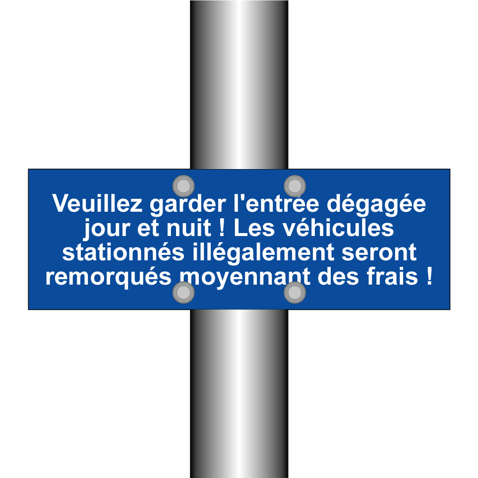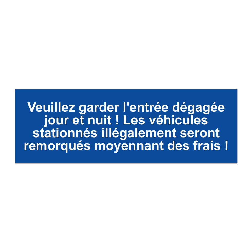 Panneau de stationnement avec le texte : "Veuillez garder l'entrée dégagée jour et nuit ! Les véhicules stationnés illégalement seront remorqués moyennant des frais !".