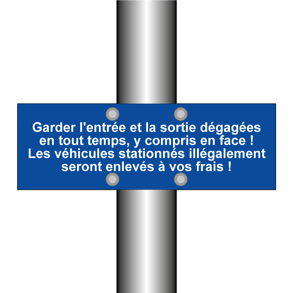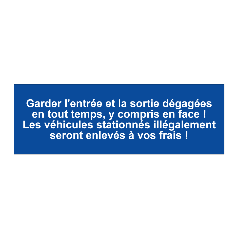 Panneau de stationnement avec le texte : "Garder l'entrée et la sortie dégagées en tout temps, y compris en face ! Les véhicules stationnés illégalement seront enlevés à vos frais !".