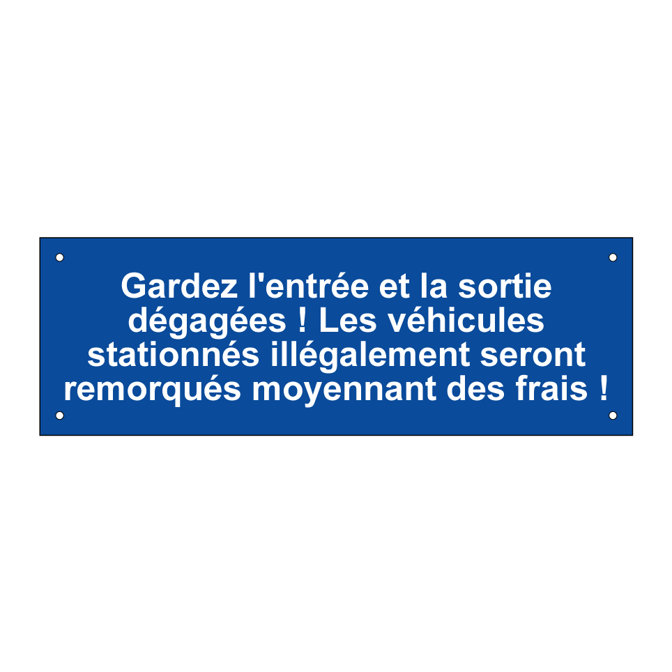 Panneau de stationnement avec le texte : "Gardez l'entrée et la sortie dégagées ! Les véhicules stationnés illégalement seront remorqués moyennant des frais !".