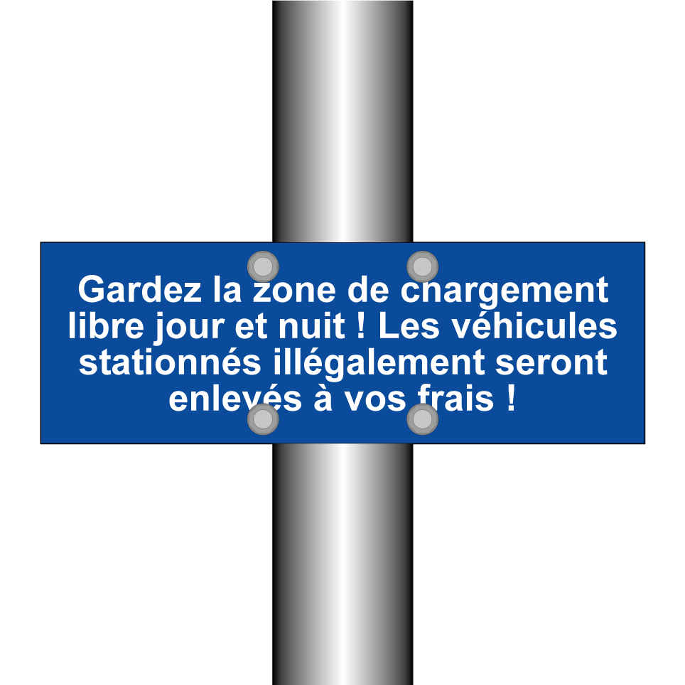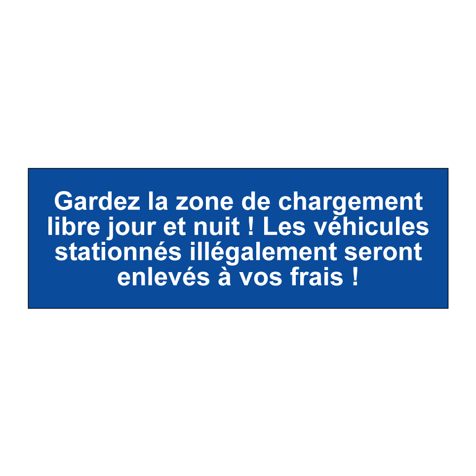 Panneau de stationnement avec le texte : "Gardez la zone de chargement libre jour et nuit ! Les véhicules stationnés illégalement seront enlevés à vos frais !".