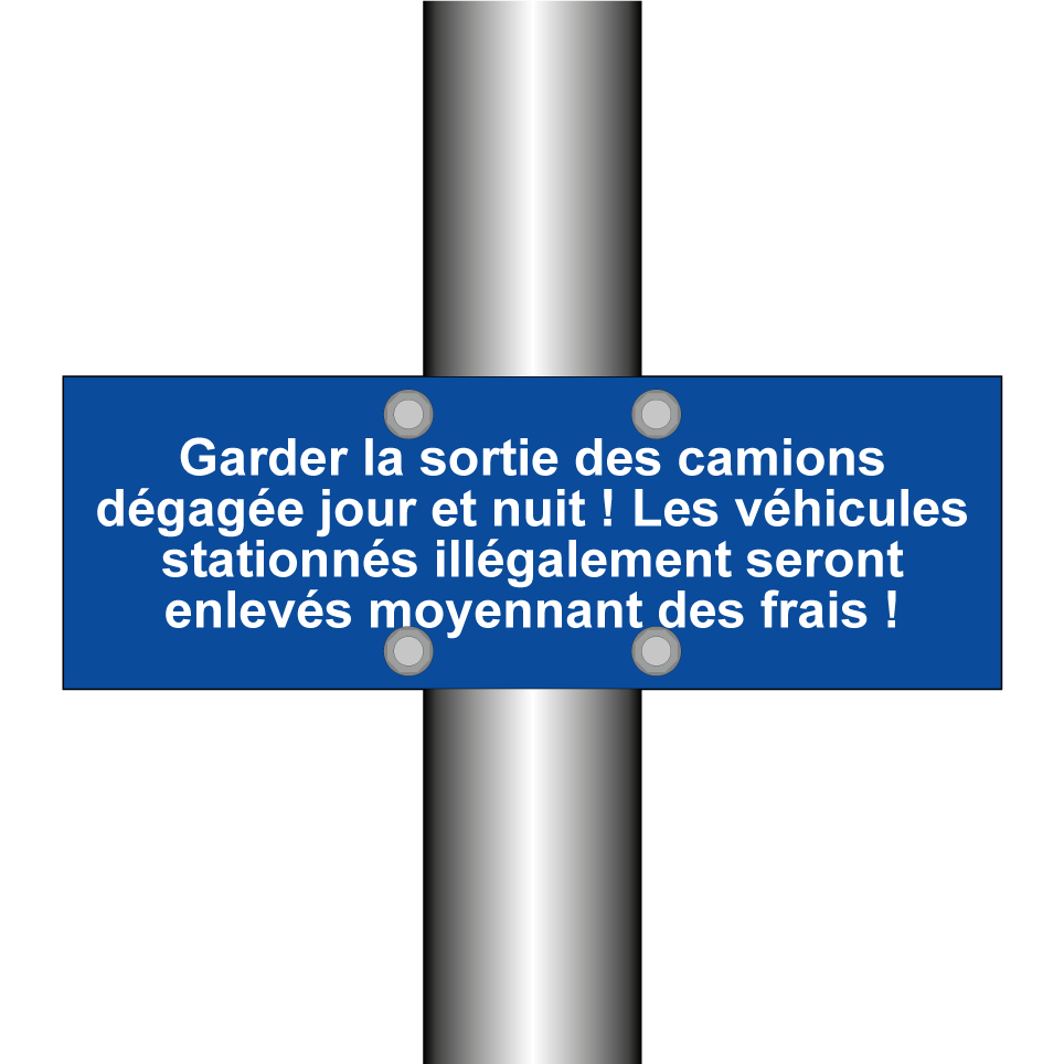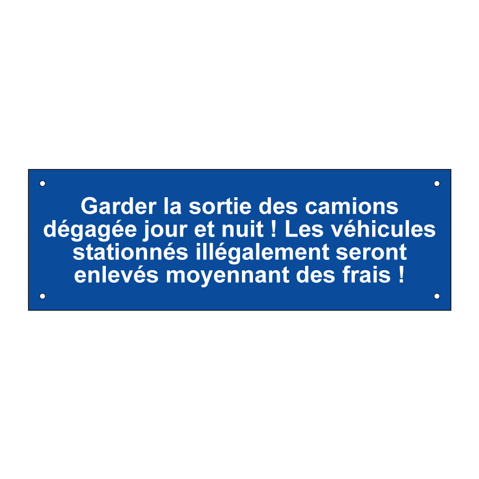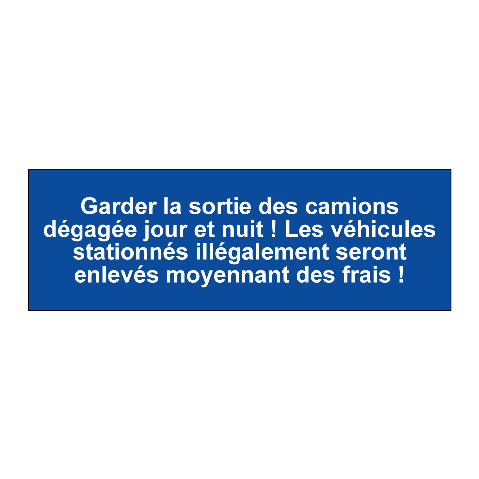 Panneau de stationnement avec le texte : "Garder la sortie des camions dégagée jour et nuit ! Les véhicules stationnés illégalement seront enlevés moyennant des frais !".