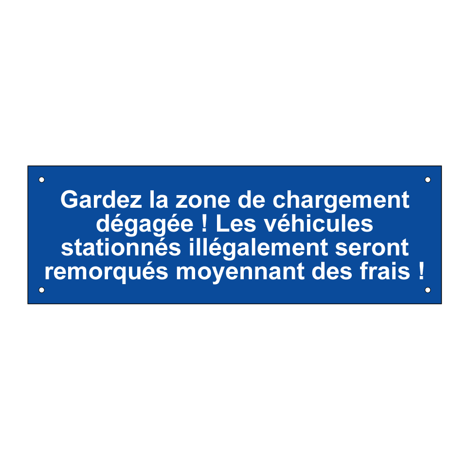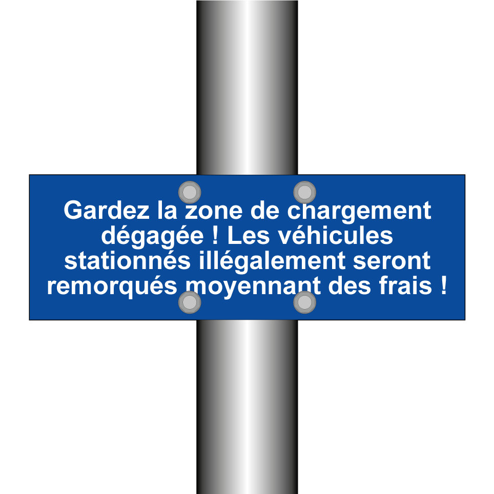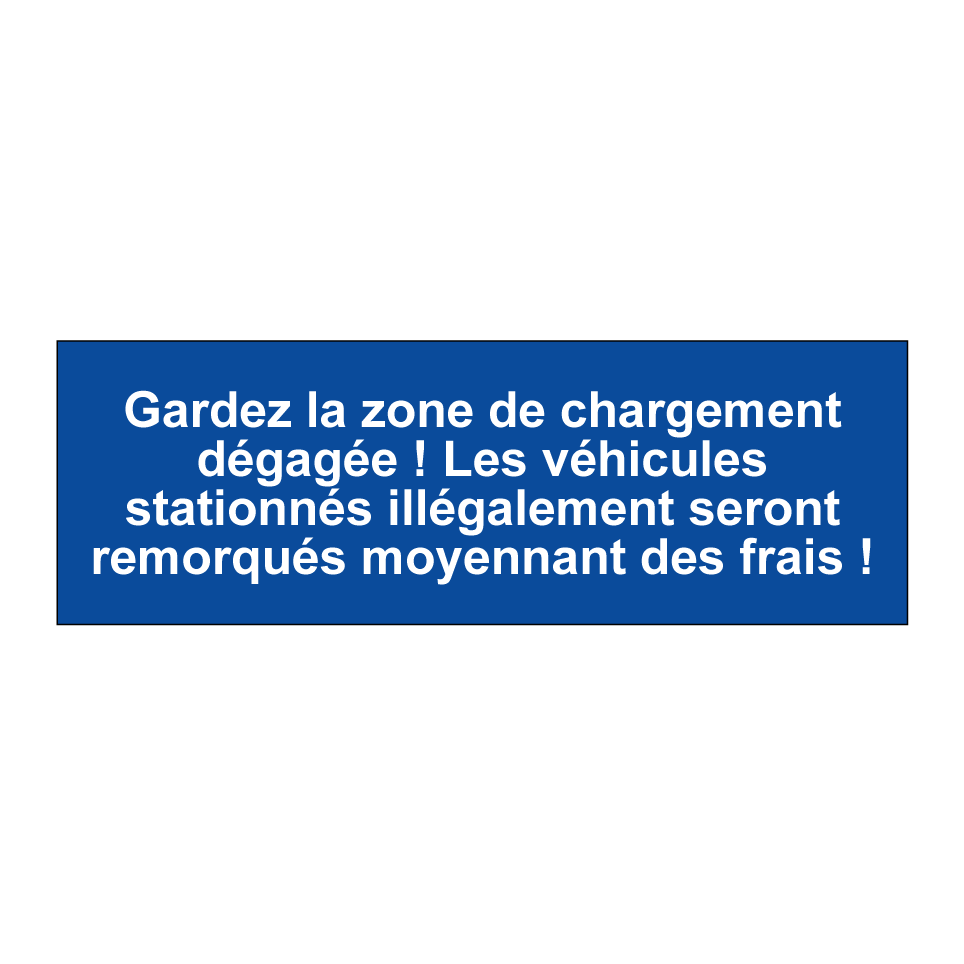 Panneau de stationnement avec le texte : "Gardez la zone de chargement dégagée ! Les véhicules stationnés illégalement seront remorqués moyennant des frais !".