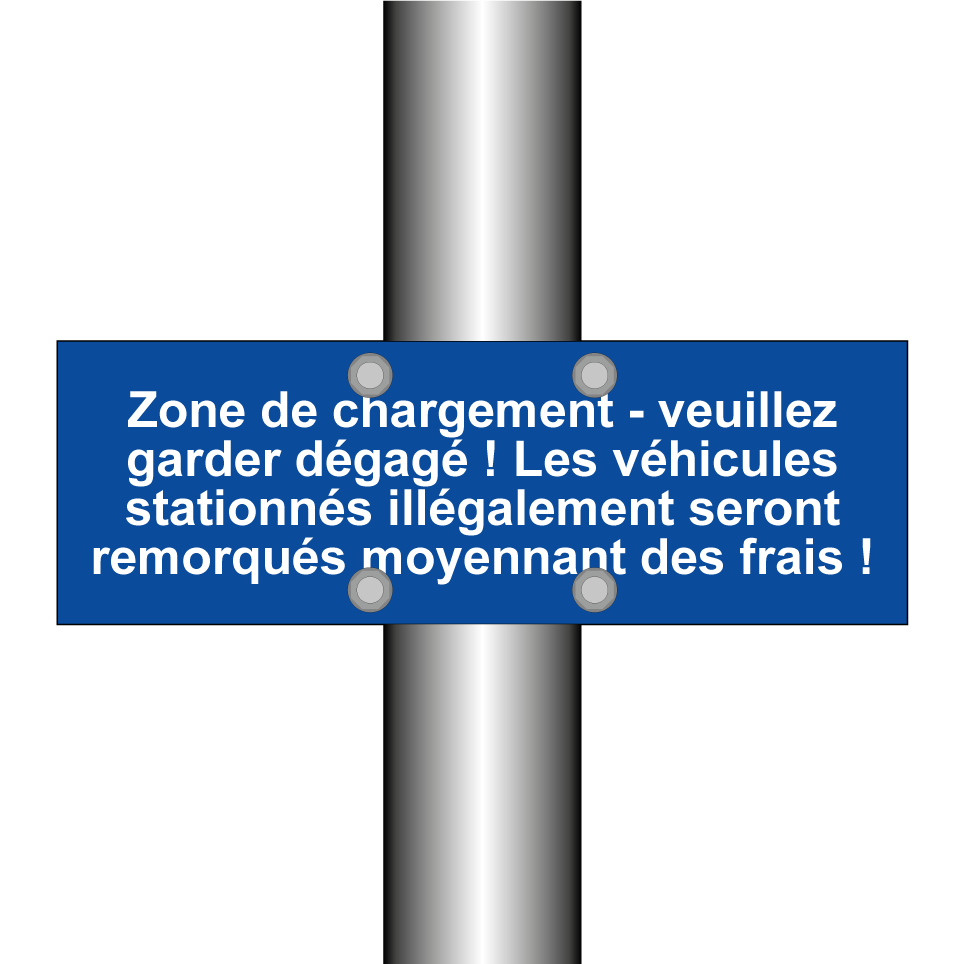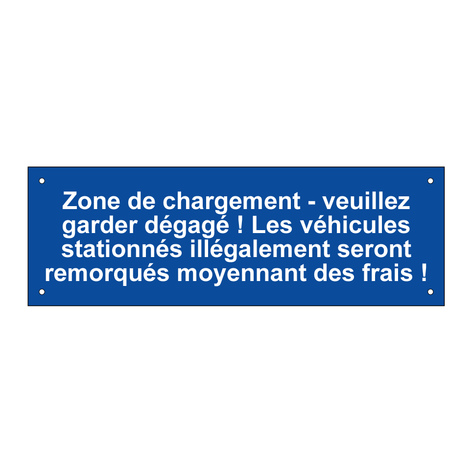 Panneau de stationnement avec le texte : "Zone de chargement - veuillez garder dégagé ! Les véhicules stationnés illégalement seront remorqués moyennant des frais !".