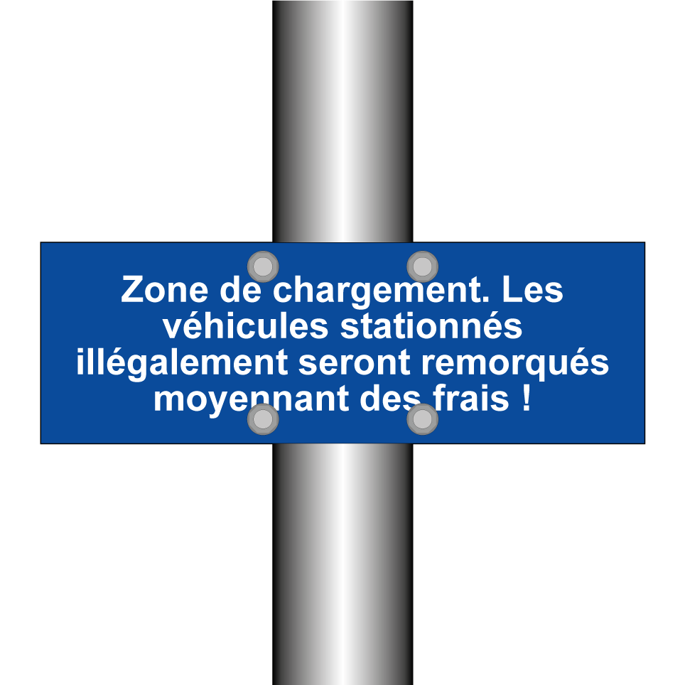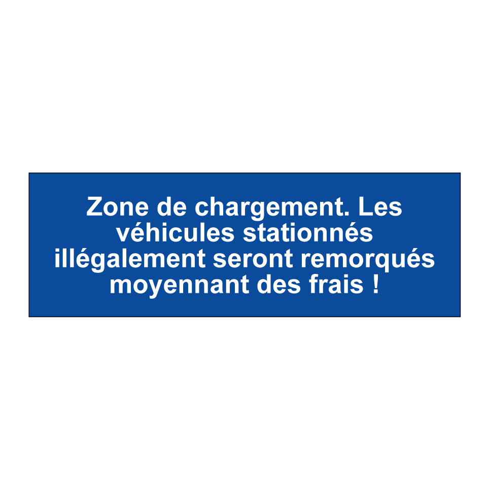 Panneau de stationnement avec le texte : "Zone de chargement. Les véhicules stationnés illégalement seront remorqués moyennant des frais !".
