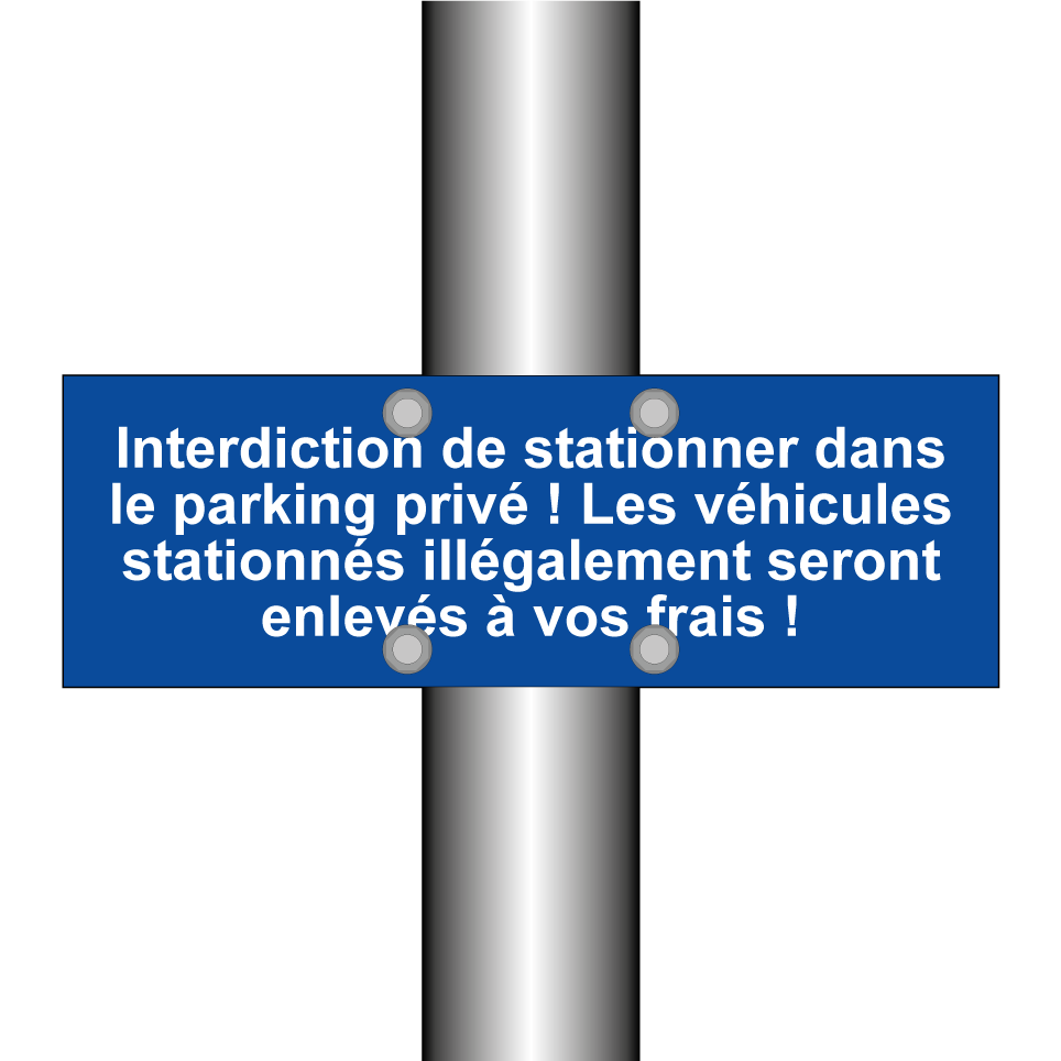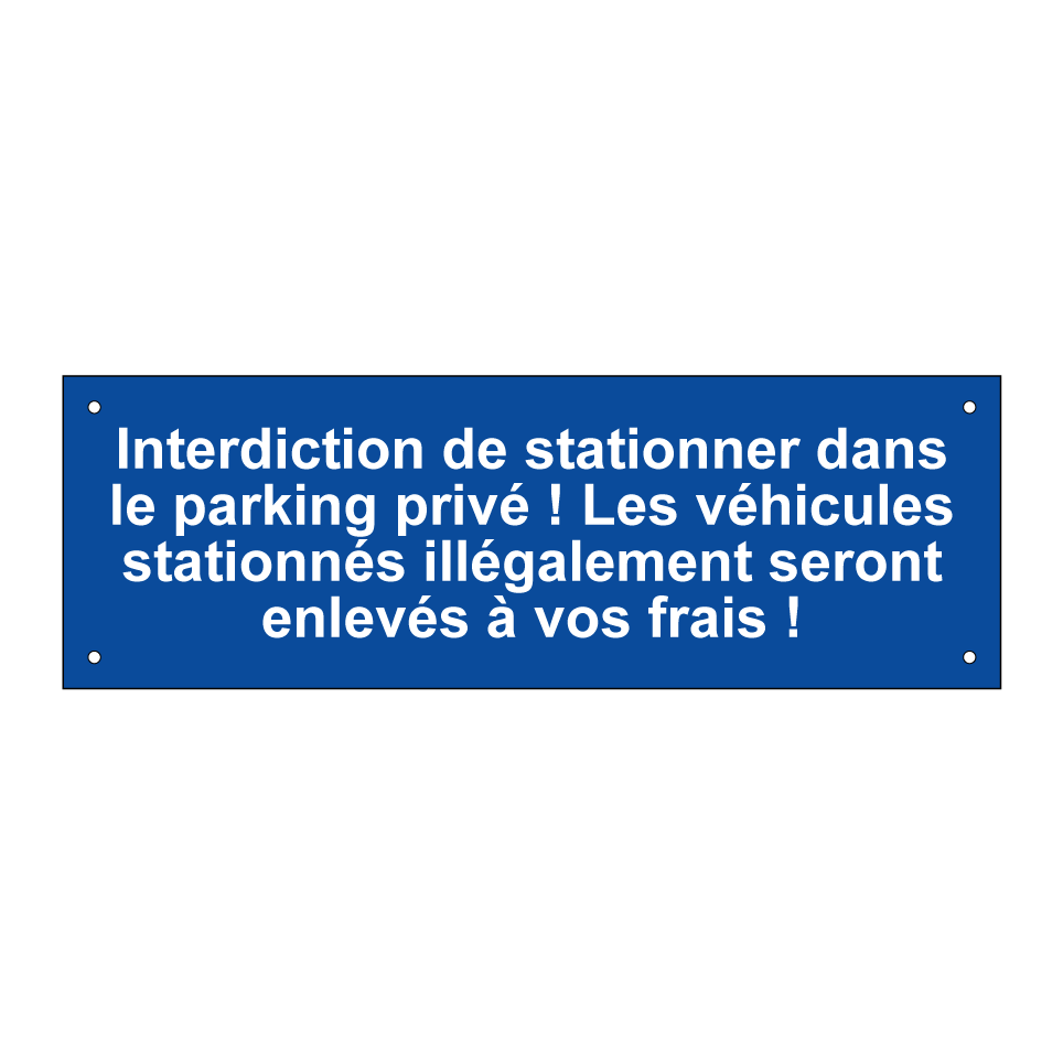 Panneau de stationnement avec le texte : "Interdiction de stationner dans le parking privé ! Les véhicules stationnés illégalement seront enlevés à vos frais !".