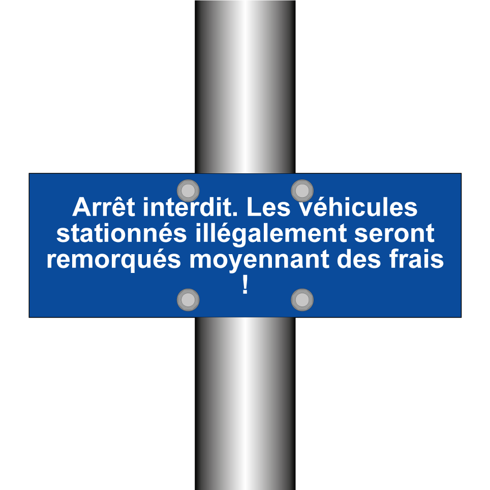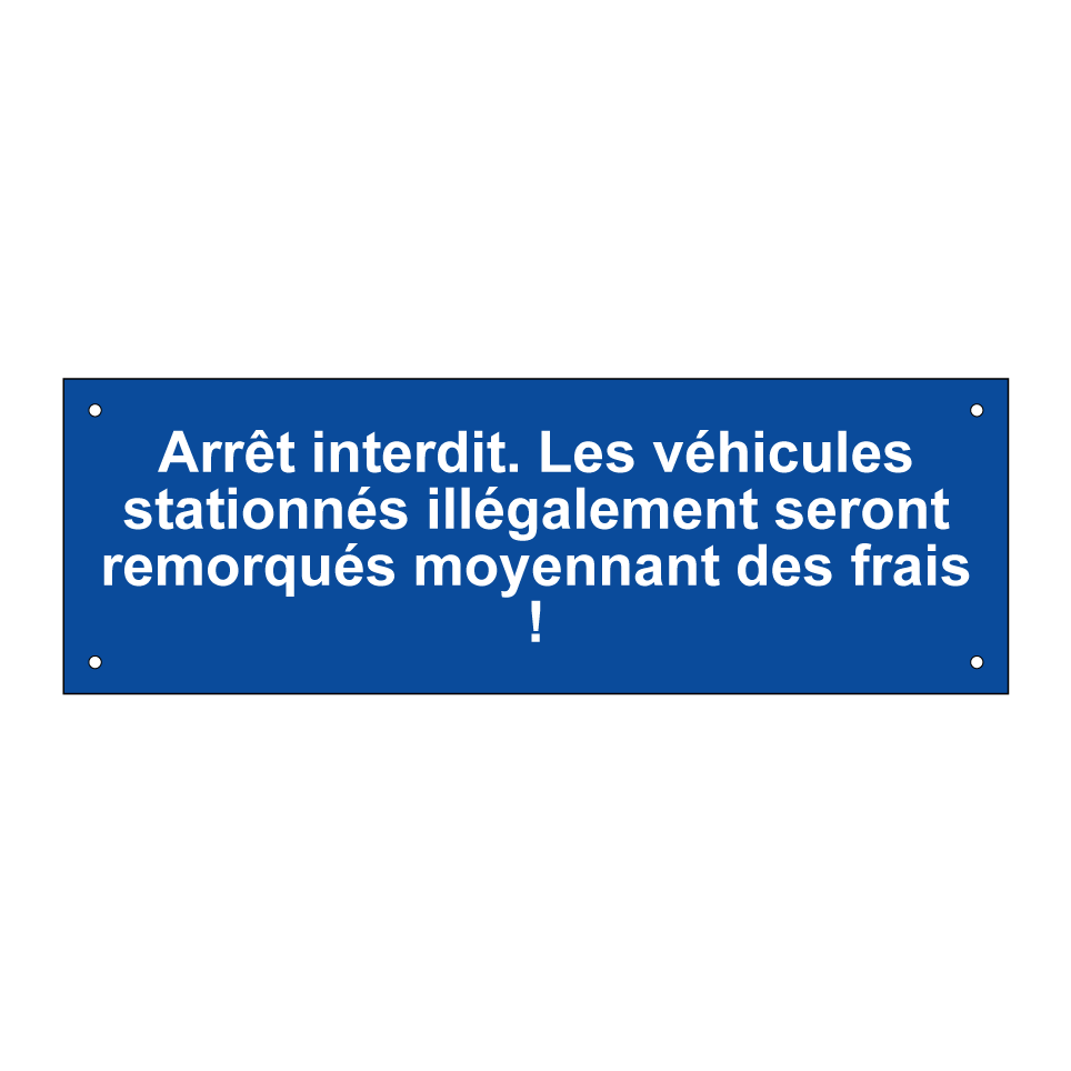 Panneau de stationnement avec le texte : "Arrêt interdit. Les véhicules stationnés illégalement seront remorqués moyennant des frais !".