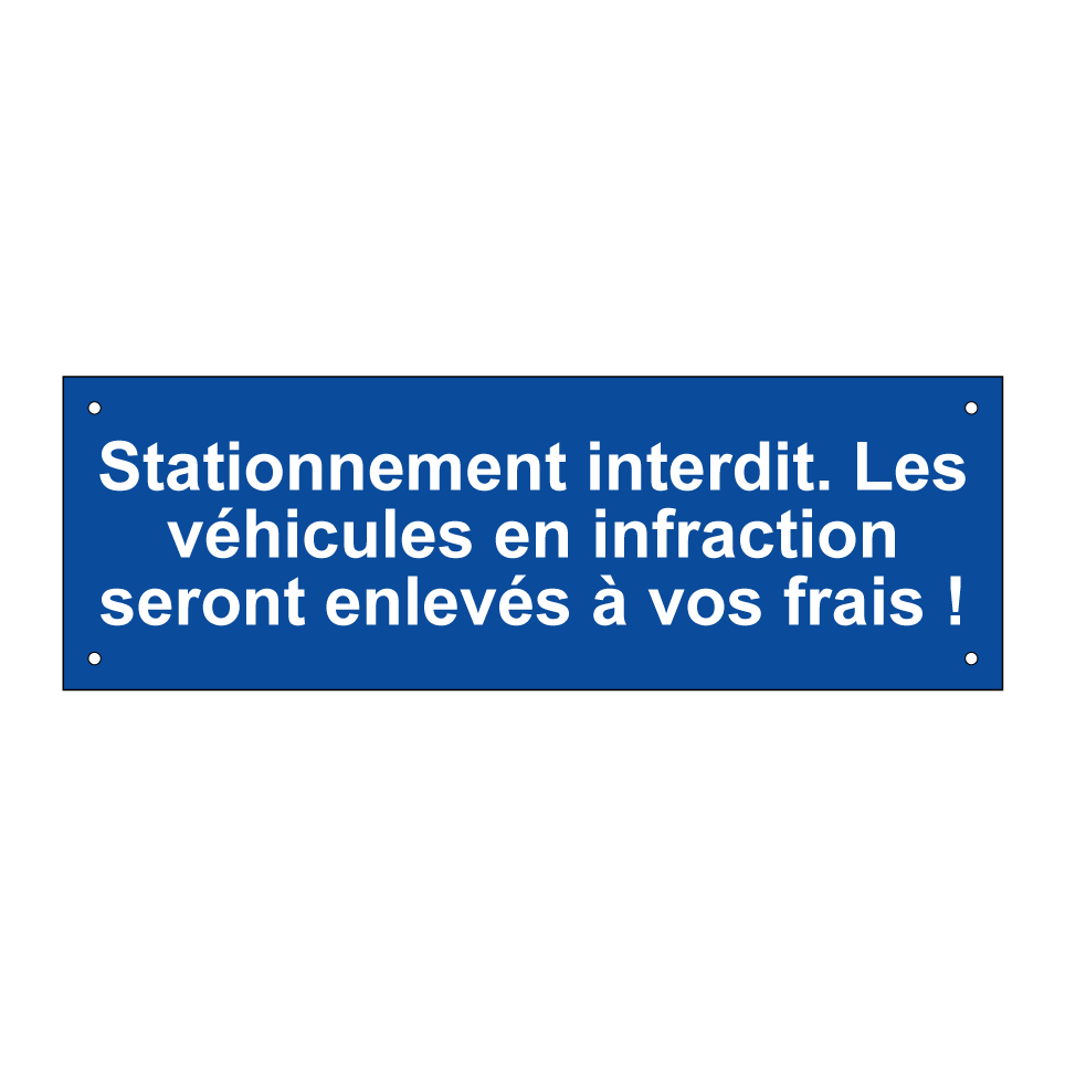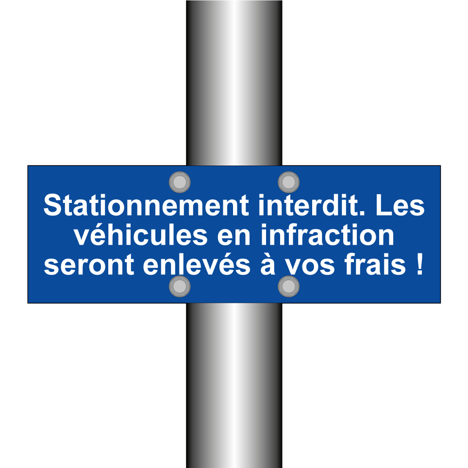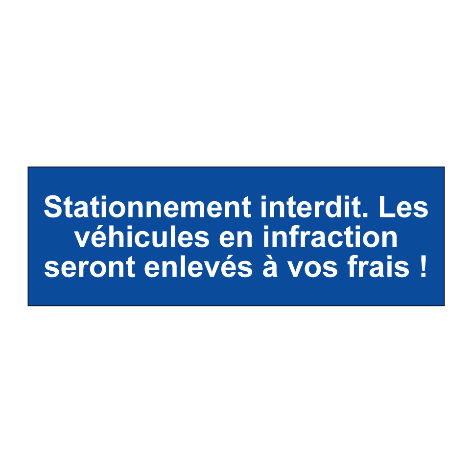 Panneau de stationnement avec le texte : "Stationnement interdit. Les véhicules en infraction seront enlevés à vos frais !".