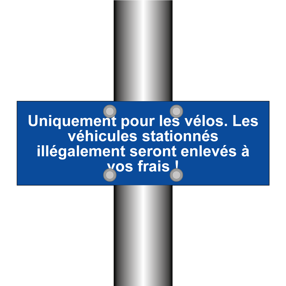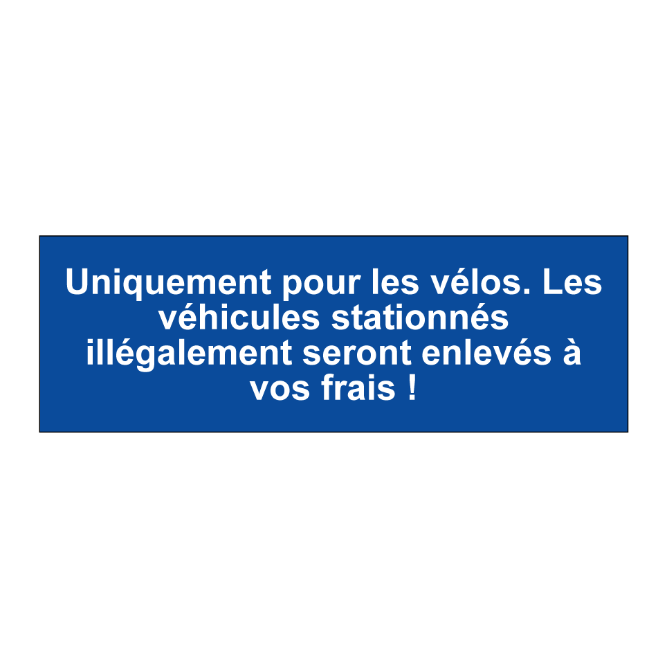 Panneau de stationnement avec le texte : "Uniquement pour les vélos. Les véhicules stationnés illégalement seront enlevés à vos frais !".
