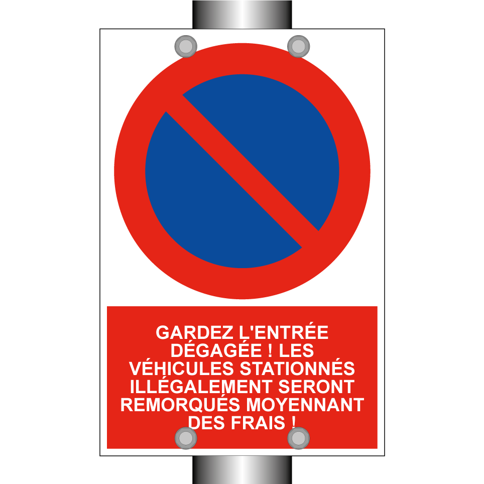 Panneau d'interdiction de stationner avec le texte : "Gardez l'entrée dégagée ! Les véhicules stationnés illégalement seront remorqués moyennant des frais !" et une symbolique claire.