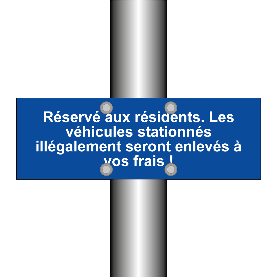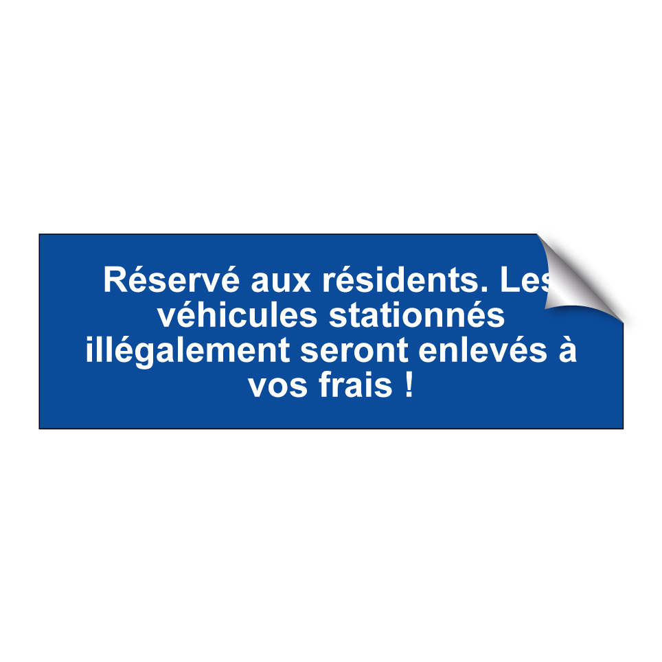 Panneau de stationnement avec le texte : "Réservé aux résidents. Les véhicules stationnés illégalement seront enlevés à vos frais !".