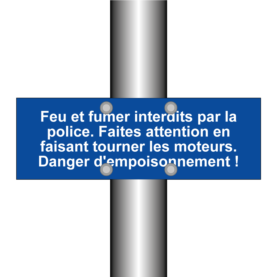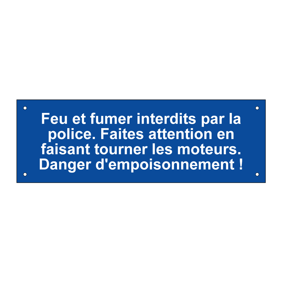 Panneau de stationnement avec le texte : "Feu et fumer interdits par la police. Faites attention en faisant tourner les moteurs. Danger d'empoisonnement !".