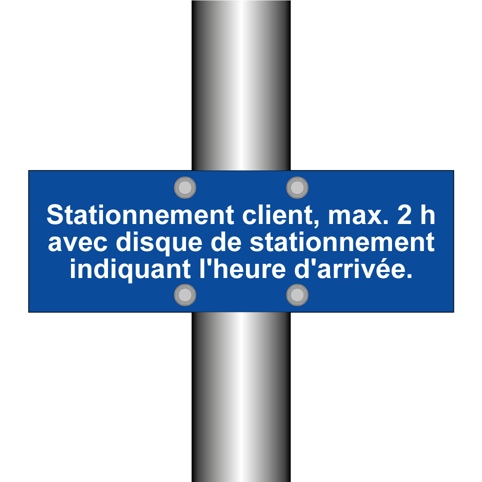 Panneau de stationnement avec le texte : "Stationnement client, max. 2 h avec disque de stationnement indiquant l'heure d'arrivée.".