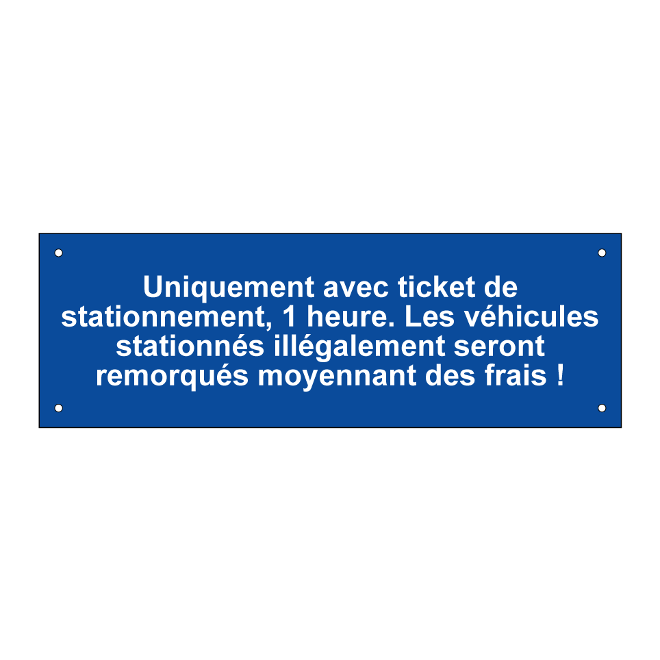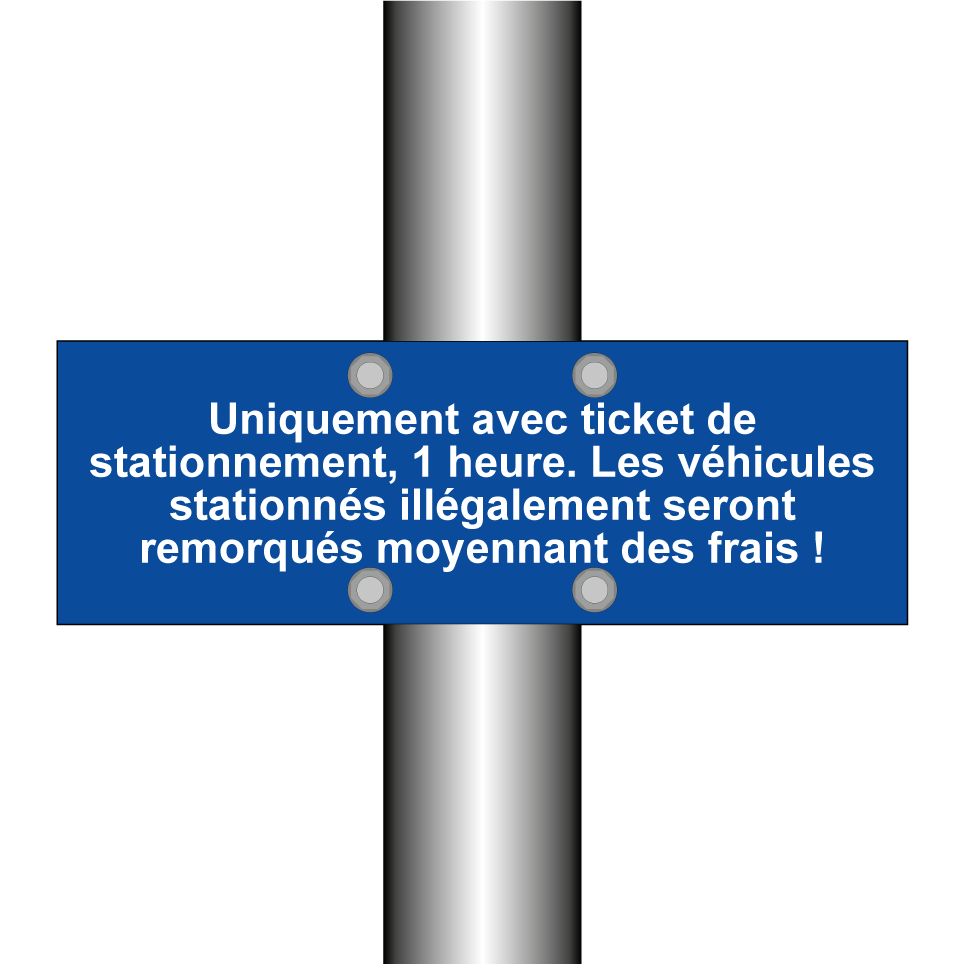 Panneau de stationnement avec le texte : "Uniquement avec ticket de stationnement, 1 heure. Les véhicules stationnés illégalement seront remorqués moyennant des frais !".
