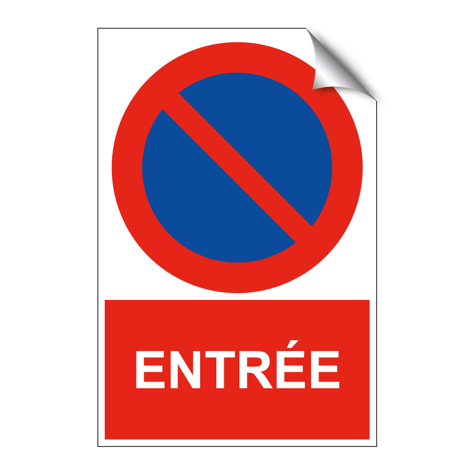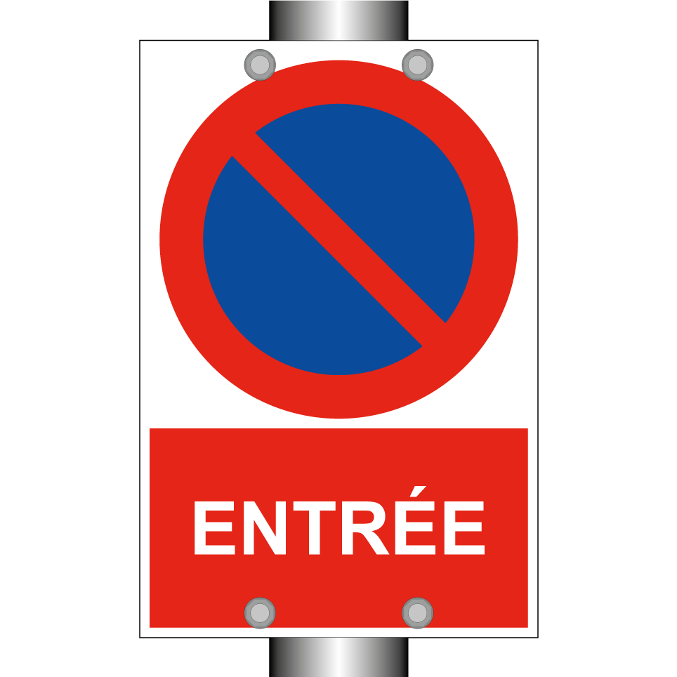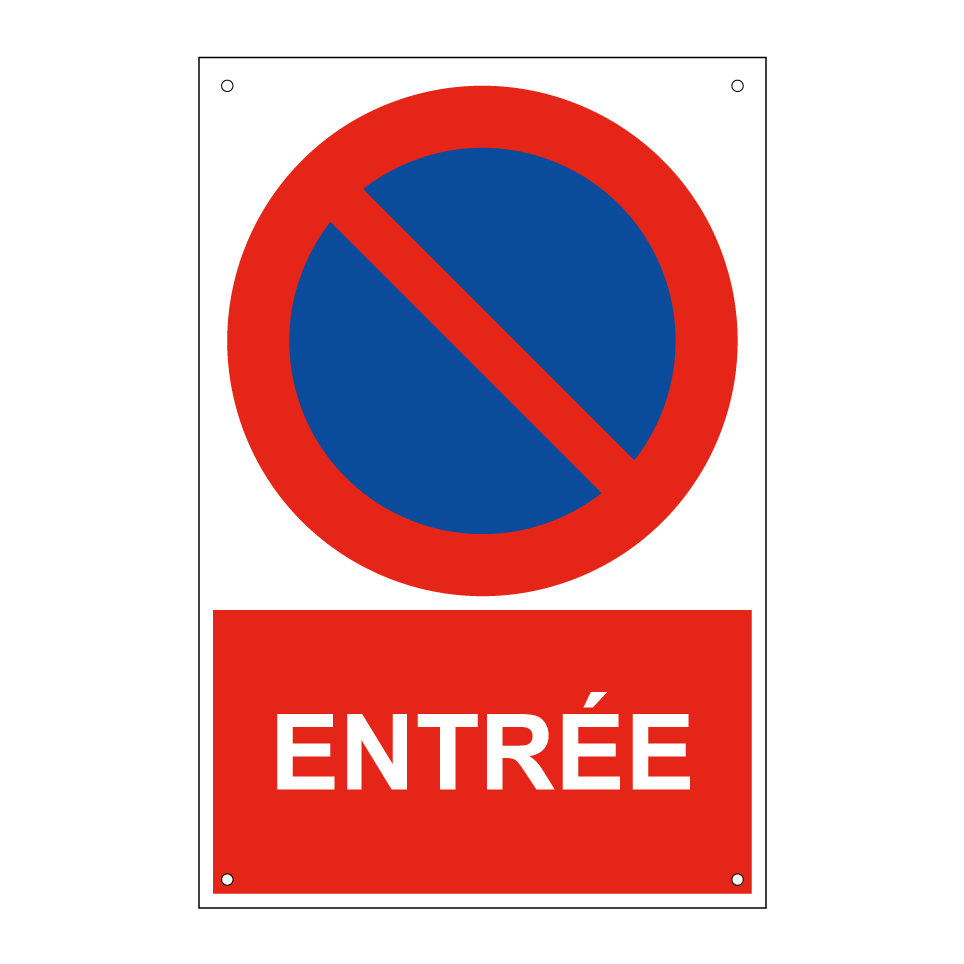 Panneau d'interdiction de stationner avec le texte : "Entrée" et une symbolique claire.